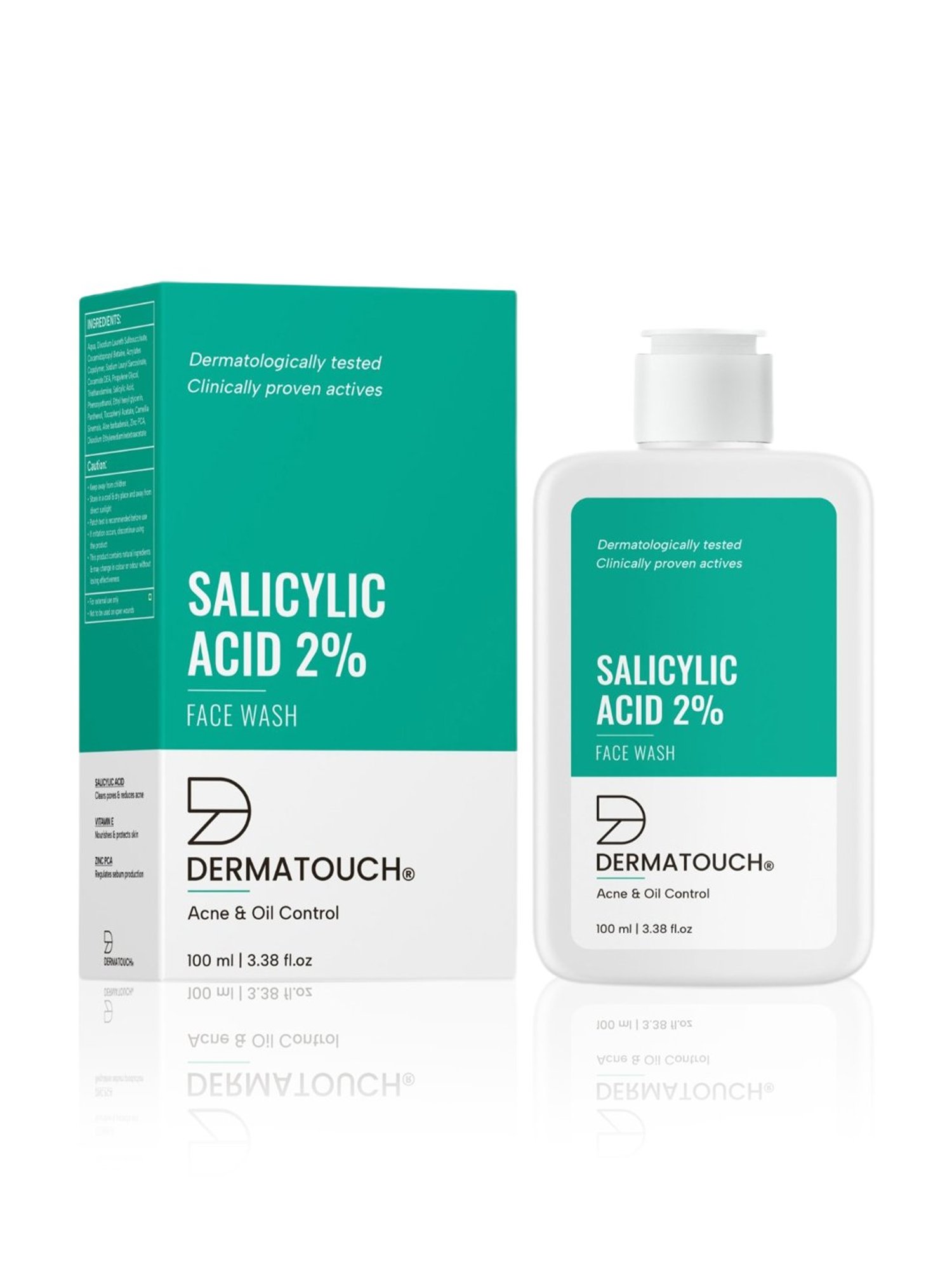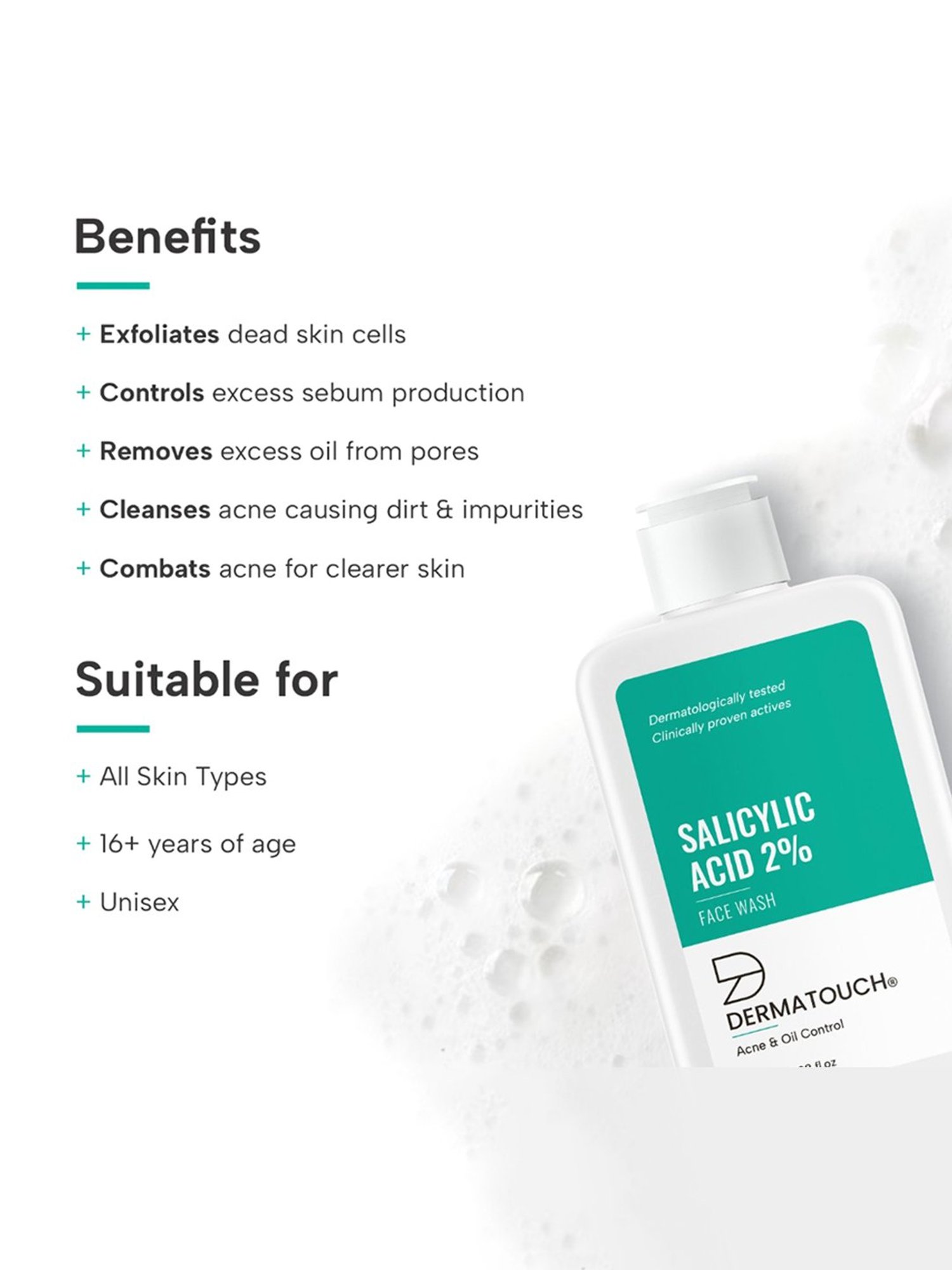 DERMATOUCH Salicylic Acid 2% Face Wash is a dermatologically tested formulation to treat acne and control the production of excess oils in the skin. It's clinically proven actives help in cleansing the dirt and impurities accumulated in the pores to avoid acne inflammation and breakouts for a clear skin. Salicylic Acid 2% Face Wash is specially formulated for acne-prone & oily skin that gently exfoliates the dead skin cells while soothing & calming the irritated skin without over sensitizing it and improves the barrier function of the skin to combat the acne for protected and nourished skin.