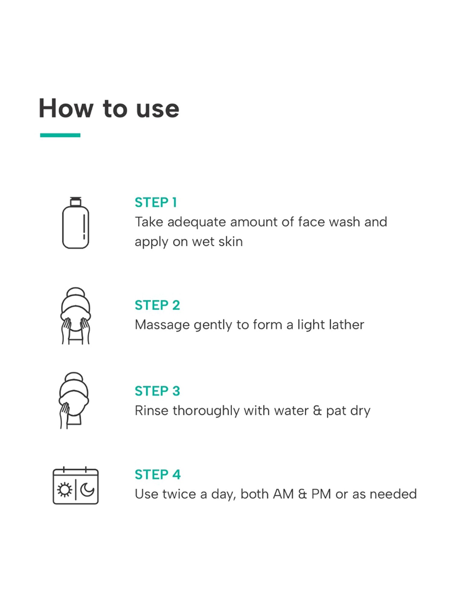 Step 1 - Take adequate amount of face wash and apply on wet skin. Step 2 - Massage gently to form a light lather. Step 3 - Rinse thoroughly with water & pat dry. Step 4 - Use twice a day,both AM & PM or as needed. |