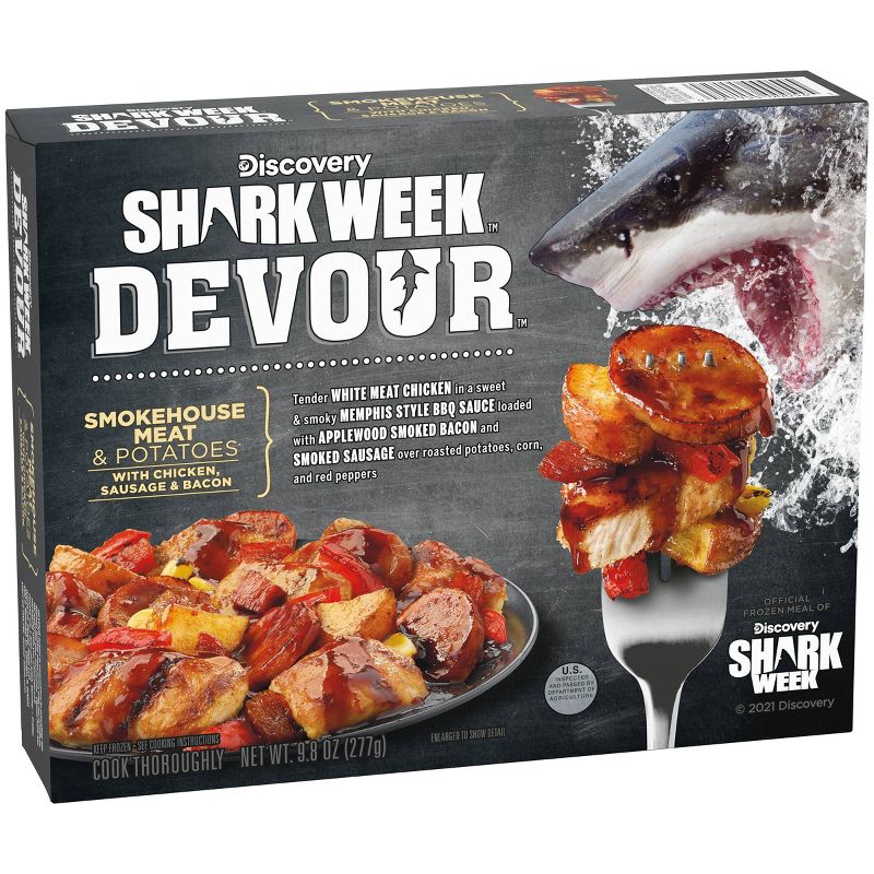 It doesn't get any more southern than Devour Smokehouse Meat and Potatoes with Chicken, Sausage and Bacon Frozen Dinners. Enjoy a pile of white meat chicken smothered in sweet and smoky memphis-style BBQ sauce with juicy cuts of smoke sausage and applewood smoked bacon. The perfectly cooked meat is tossed over seasoned roasted potatoes for a one-of-a-kind meat trifecta in our Smokehouse Meat and Potatoes with Chicken, Sausage and Bacon. You'll be enjoying this decadent dinner in under 5 minutes—all you need is a microwave. Keep frozen until ready to enjoy.