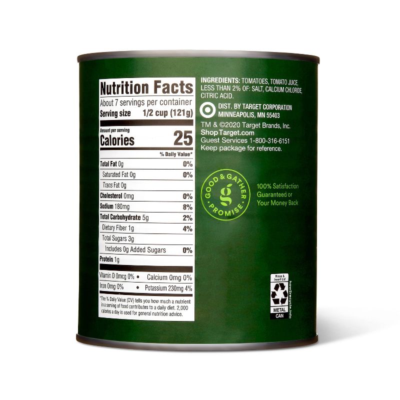 These Diced Tomatoes from Good & Gather™ make it easy for you to whip up a variety of different meals across cuisines. This can contains tomatoes grown in the USA and is made with no synthetic colors or artificial flavors. These diced tomatoes provide rich and full flavor for your homemade chili, pasta dishes, breakfast bakes, sauces and more. So whether you're cooking up a meal for the whole family or prepping lunches for the week ahead, make sure you always have a can of diced tomatoes on hand in your pantry to help you create a wide range of delicious dishes.