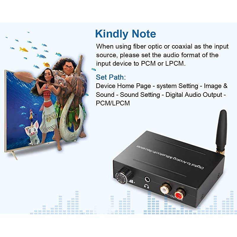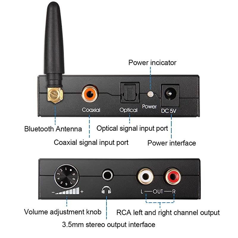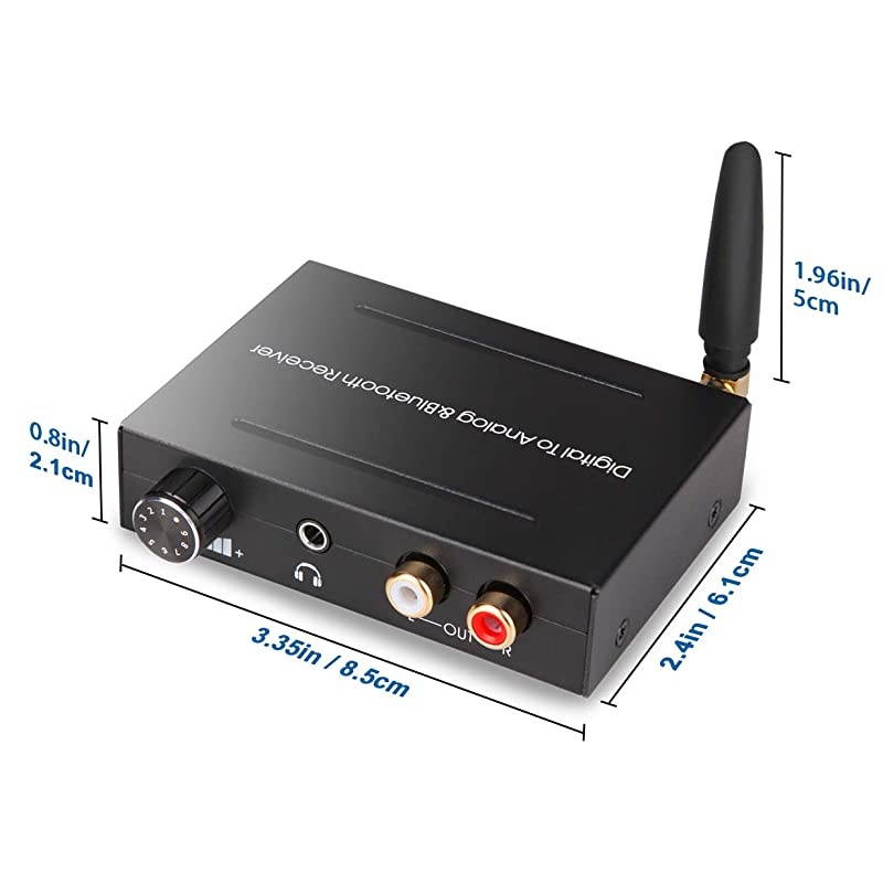 ***** *****Digital to Analog Audio Converter This DAC Converter can converts optical, coaxial, and Bluetooth-transmitted digital audio signals to Analog L/R Audio and 3.5 mm Audio Signals Output. Solve the problem of connecting different audio interfaces to analog amplifiers. *****DAC Converter with Bluetooth Use the latest Bluetooth 5.0 version lossless transmission technology, can supports mobile phone Bluetooth audio push. And Bluetooth Dedicated antenna for stable signal transmission. *****192K/24bit Audio Sampling RateBuilt-in high-performance DAC chip supports the 192K/24bit sampling rate, helping solve the problem of connecting different audio interfaces to analog amplifiers.