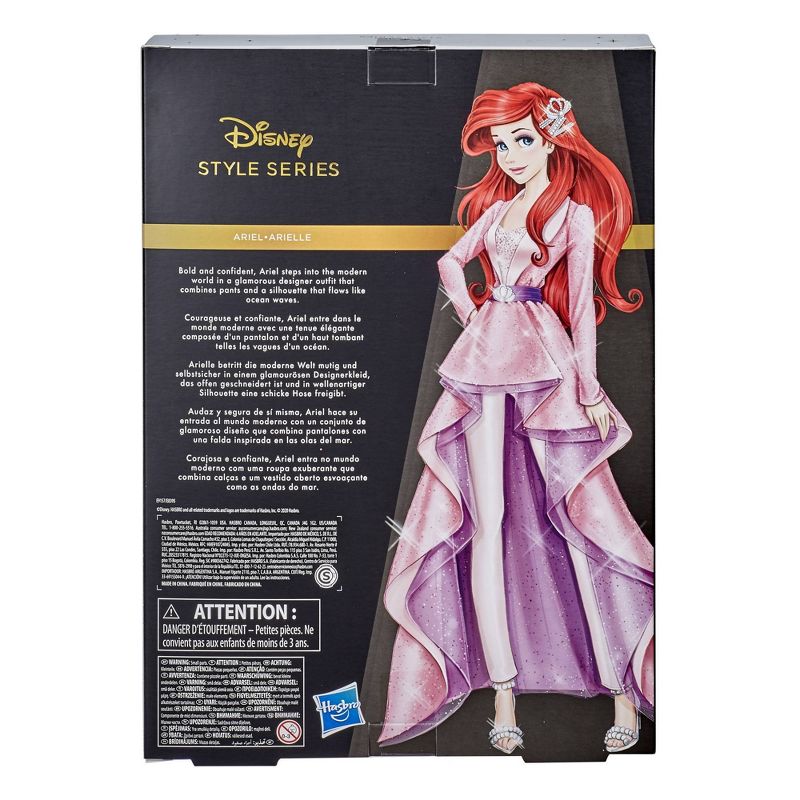 Shine a spotlight on this unique contemporary style inspired by Ariel's world with this gorgeously outfitted Ariel fashion doll. Her glamorous glittering pink and lavender-colored gown is cut away to reveal a pair of stylish slim pants and is accented by a belt with a shell-shaped buckle inspired by her story. Style Series Ariel also includes a removable pair of shoes, and an ocean-inspired hair accessory to tie her whole ensemble together. Her flowing red hair will remind fans of their favorite heroine from Disney's classic movie, The Little Mermaid. Fans can collect other dolls in Disney's Style Series to take their collection from classic to contemporary. (Each sold separately. Subject to availability.)