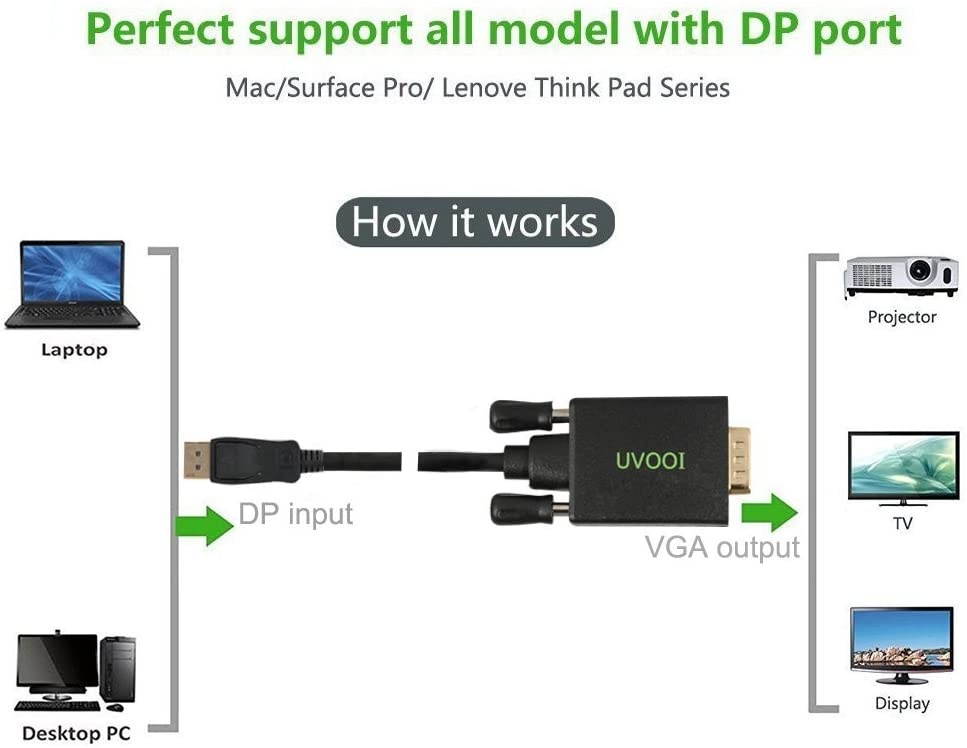 ??Attribute??sent out as the same day ships by UVOOI. DisplayPort (DP) to vga 15ft cable adapter/converter is use to connect a DisplayPort port(DP, DP++) compatible laptop or desktop to a HD monitor or projector with VGA port seamlessly and directly(no charge/adapter cable required). ??Incredible Performance??Supports 1920x1200 / 1080P (Full HD) @60Hz resolution video. Transmits high-definition video from your computer for video streaming or gaming??Support advanced system ?? Windows 7, 8, 8.1, 10, Chrome OS, Mac OS X 10.10. 3 or higher and backward compatible??Premium Material??Standard Edition DP to VGA cable made of gold-plated connectors, bare copper conductors, and foil & braid shielding combine together to provide both superior cable performance and reliable connectivity??Kindly Note??Provide unconditional 2 year warranty, please don't hesitate to Contact Us by email.