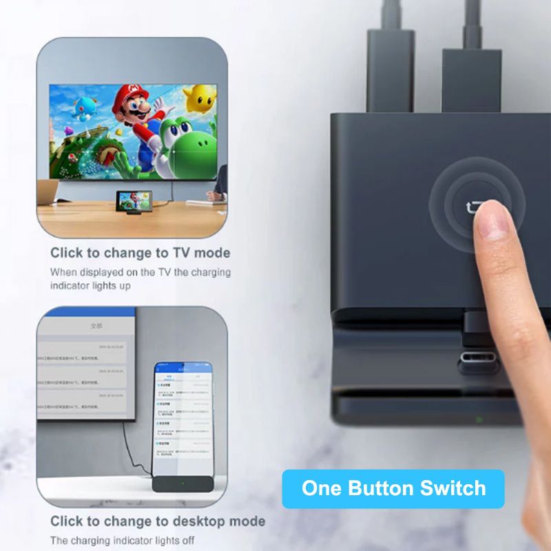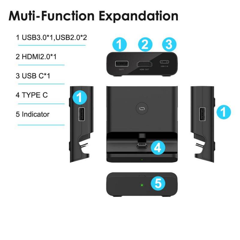 ?5 in 1 Stand For Swith&Lite?Buldin HDMI*1, USB 3.0 *1, USB 2.0 *2, USB C *1, you could play while charging, In both TV mode and Desktop Mode, ?One keySwitch?You could switch between console display and TV display in seconds, by just pressing the Key on the dock. Support 4K, 1080P and 720P video output (Nintendo Switch only supports 1080P). ?Better Angle Stand?110° Angle Stand, you could get a better view while playing. ?USB C 3.1 Interface?You could use it as a USB C 3.1 Hub, it also could work with other USB C 3.1 devices like Cellphone and tablet.