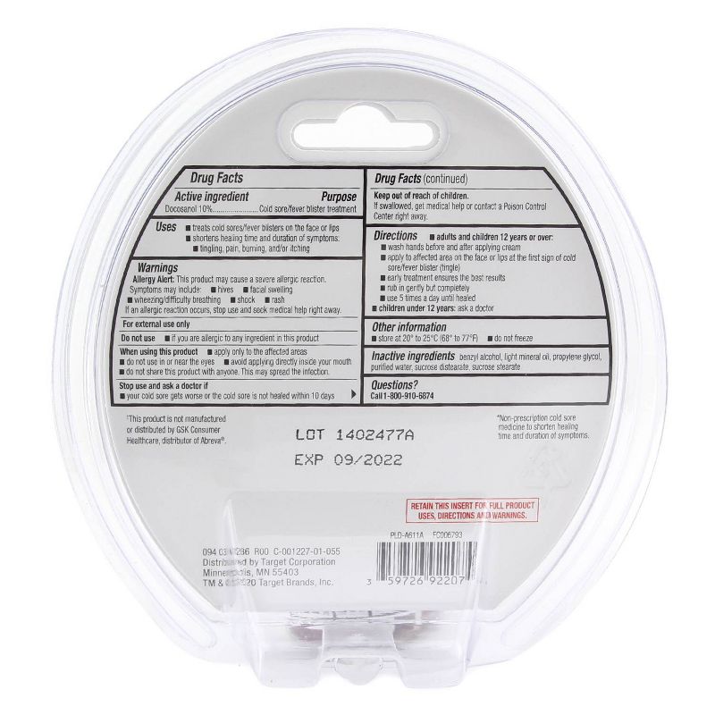 Docosanol Cream 10% is an FDA approved, non-prescription cold sore medicine that can actually shorten healing time and the duration of symptoms. The sooner you start using Docosanol Cream, the sooner you can begin healing your cold sore. Each tube contains 2 grams of cream. If you’re not satisfied with any Target Owned Brand item, return it within one year with a receipt for an exchange or a refund.
