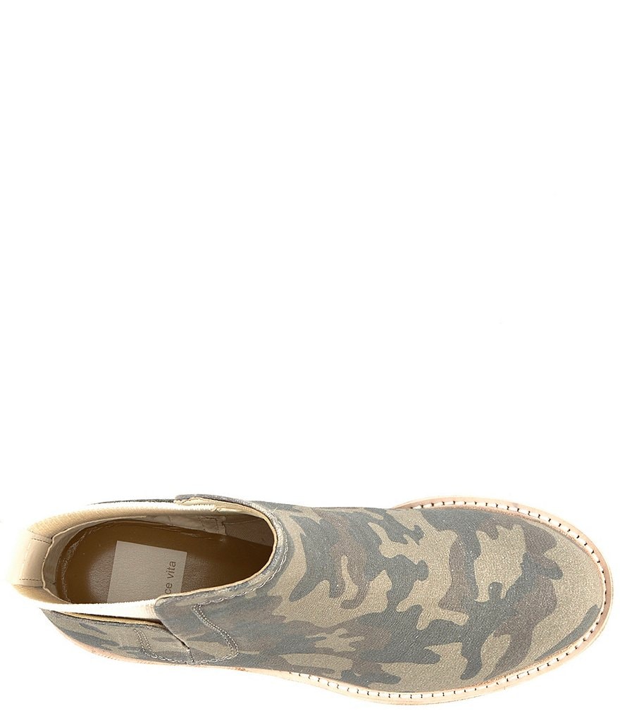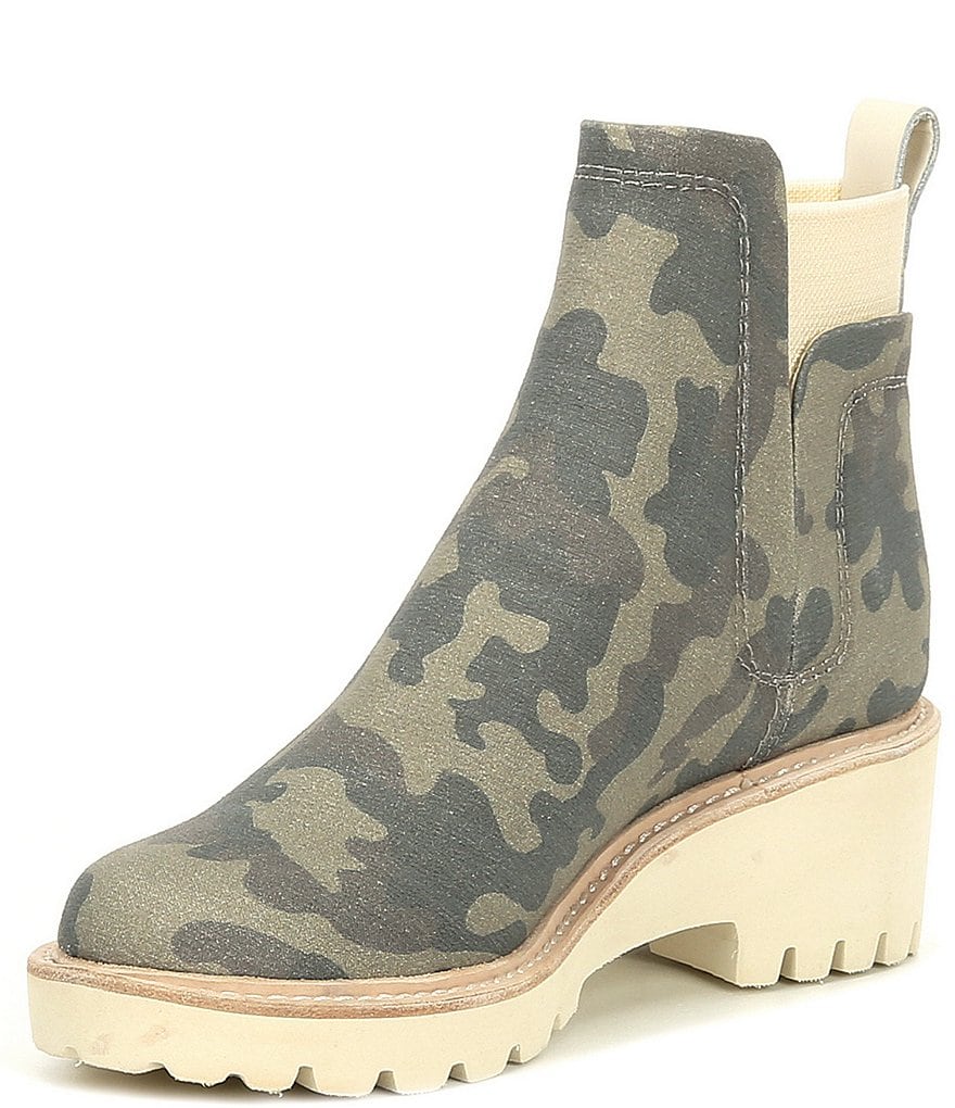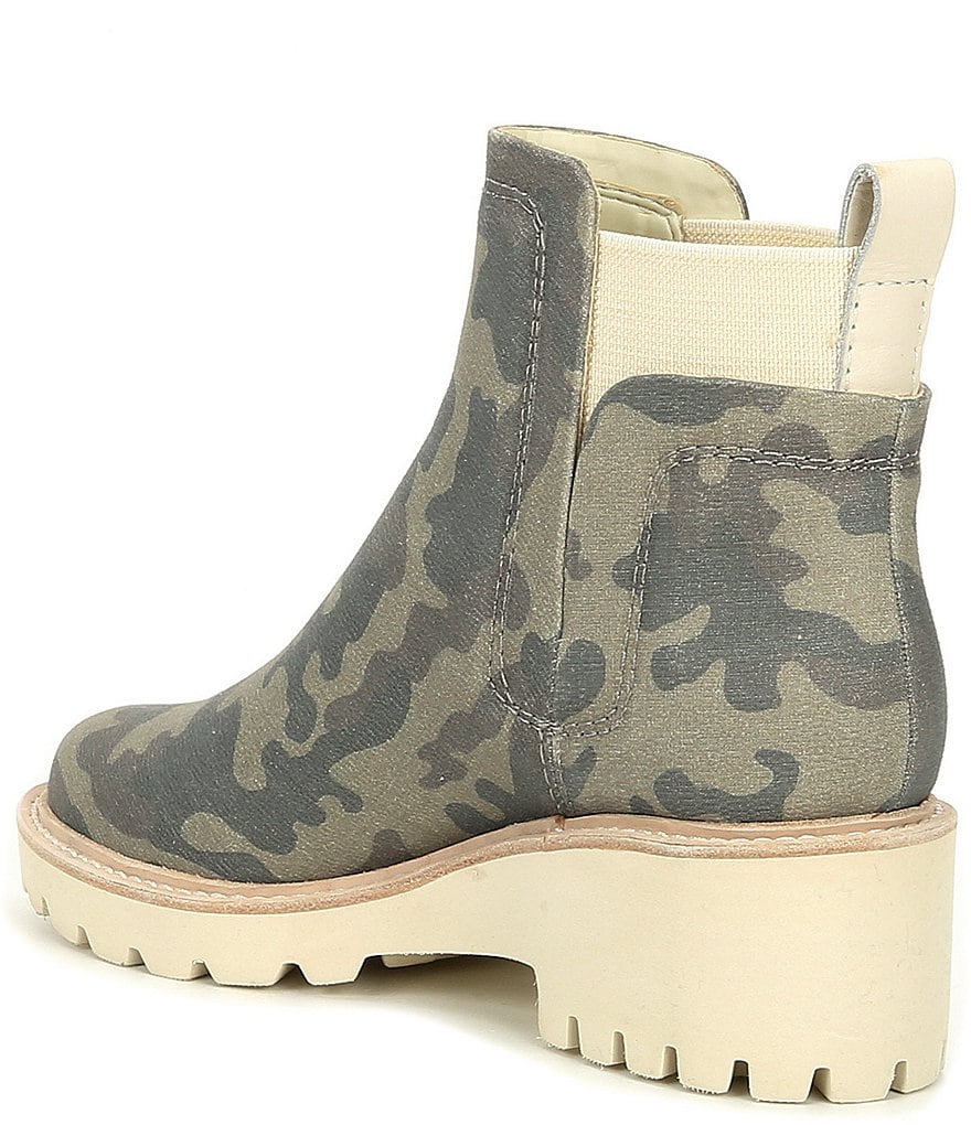 From Dolce Vita, the Huey Camo Print Canvas Block Heel Lug Sole Chelsea Booties feature: