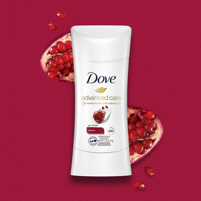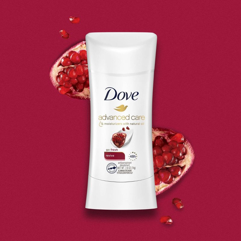 Looking for effective sweat and odor protection that's also gentle on underarm skin? Dove Advanced Care Revive Antiperspirant Deodorant Stick gives you up to 48 hours of long-lasting protection to keep you feeling comfortable all day. A crisp, fresh, fruity scent with a blend of florals – it’s the perfect morning wake up call. Our formula, containing Dove's signature 1/4 moisturizers with natural oil and 0% alcohol (ethanol), takes gentle care of your underarms. Our kind-to-skin formula helps skin recover from shaving irritation, leaving your underarms feeling soft and comfortable. Designed with skin in mind, this pampering deodorant delivers effective protection in an ultra-caring way. Use this antiperspirant deodorant stick regularly to enjoy comfortable and healthy-feeling underarms.