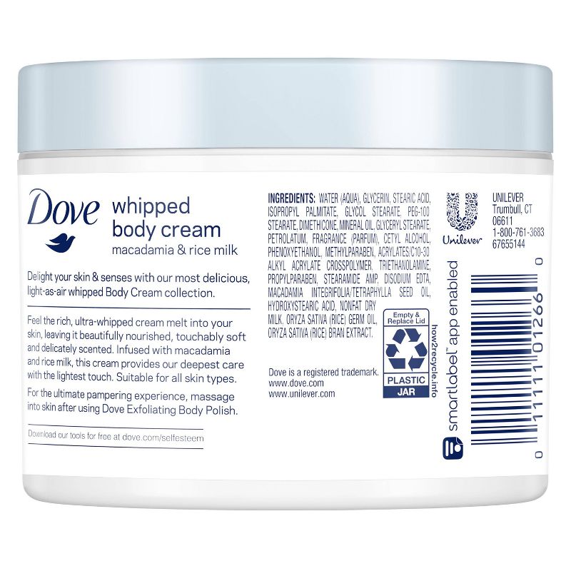 There's nothing quite like deep moisturizing nourishment from a body lotion for dry skin - but that care should come hand-in-hand with lightness. Beautifully creamy and light to the touch, Dove Macadamia & Rice Milk Whipped Body Cream provides the indulgence your dry skin deserves, together with the lasting nourishment it needs. With a light-as-air, whipped texture Dove Macadamia & Rice Milk Whipped Body Cream nourishes deeply, to leave your skin feeling touchably soft and smooth without a greasy feel. The body cream provides effective and long lasting 72hr moisturization, while relieving your skin's dryness in just one use to reveal healthier-looking, replenished skin! With its lightly whipped texture, the scented body lotion melts into your skin, soothing and moisturizes dry skin to leave it feeling touchably soft and smooth. The airy body cream is infused with a light fragrance of macadamia, rice milk, and undertones of delicious vanilla and warm woods, leaving your skin delicately scented and beautifully smooth. For even more indulgence, massage in your lightly scented lotion after buffing away dry skin in the shower with Dove Crushed Macadamia & Rice Milk Body Polish - for skin that feels luxuriously pampered, hydrated and smoother than ever before.