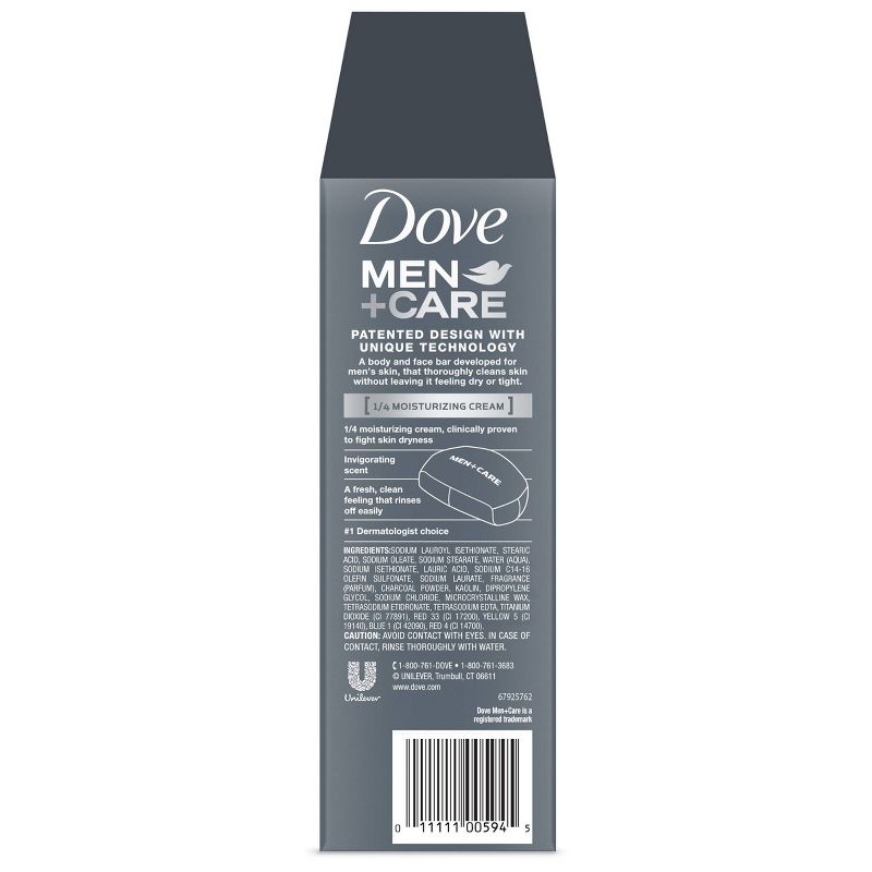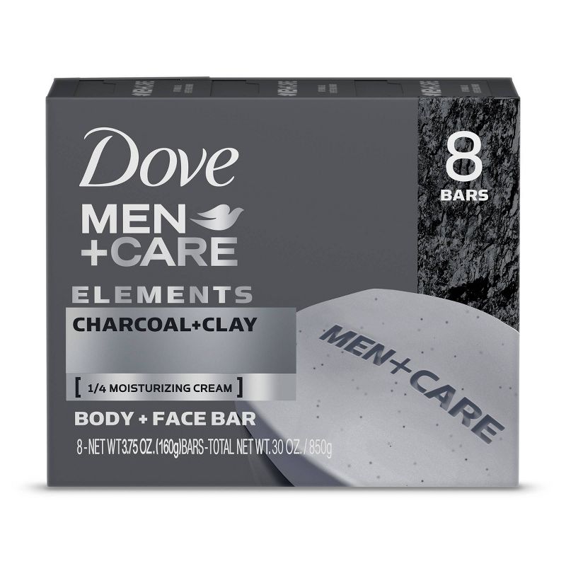 Dove Men+Care Body and Face Bar is a smart addition to your everyday assortment of shower products. Designed to wash body and face, this handy 2-in-1 bath soap lets you cut down on the number of products you need to get a great head to toe clean. Inspired by natural purifiers charcoal and clay, this bath and body bar combines deep cleansing performance with the benefits of Dove's 1/4 moisturizing cream — for clean, hydrated skin that lasts beyond the shower.