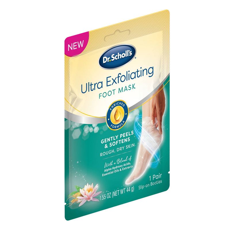 We designed Dr. Scholl’s® Ultra Exfoliating Foot Mask to provide an at-home pampering spa experience to gently peel and soften rough, dry, skin. This pair of disposable slip-on booties are infused with an enriched formula; a proprietary blend of alpha hydroxy acids, essential oils, natural extracts and urea to help soften, exfoliate and hydrate rough, dry, flakey skin. Lotion enriched with peppermint oil and menthol delivers a cool, tingling sensation while soothing the skin. Skin will be left feeling silky smooth & soft within days.