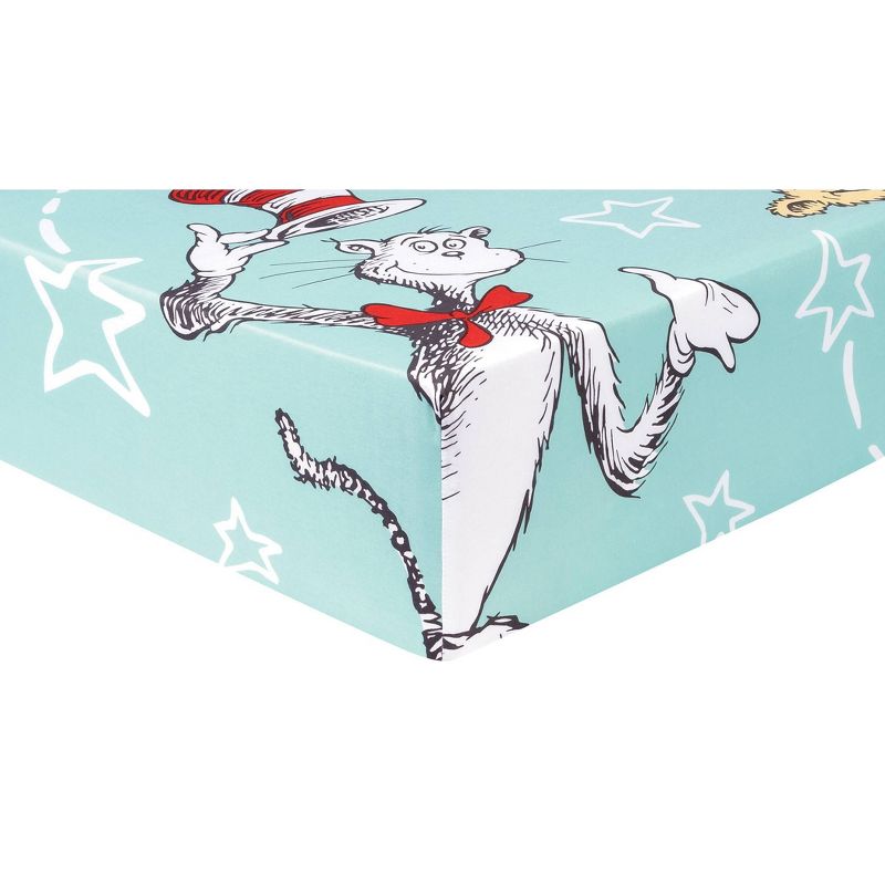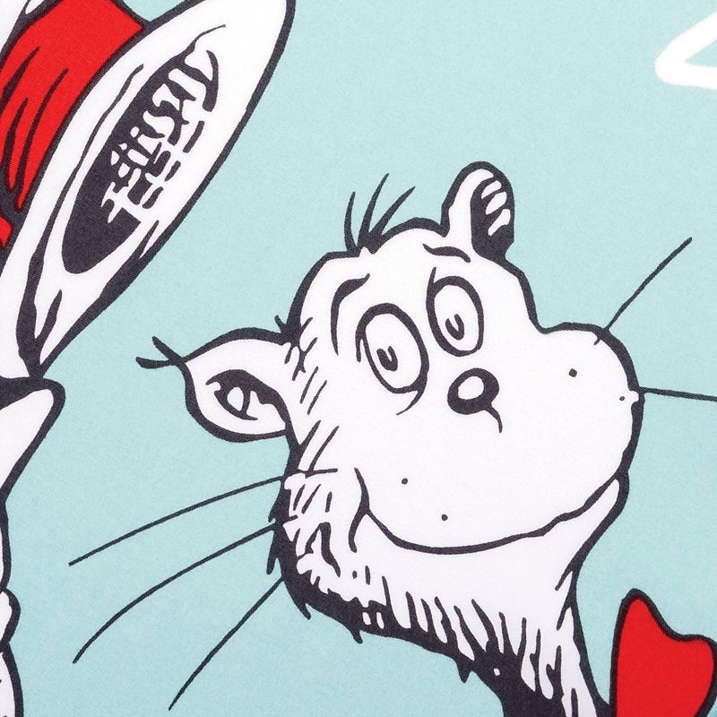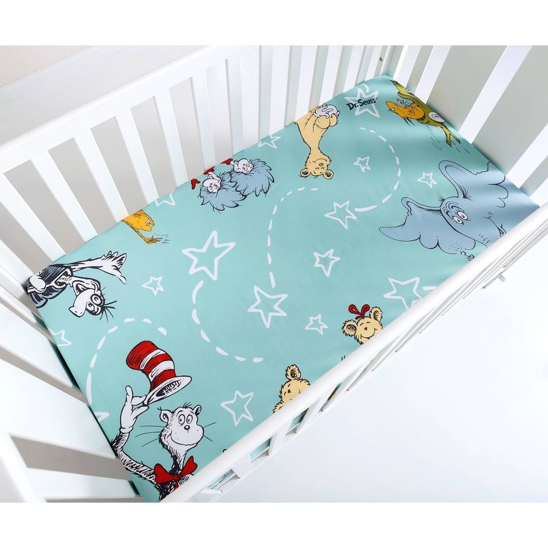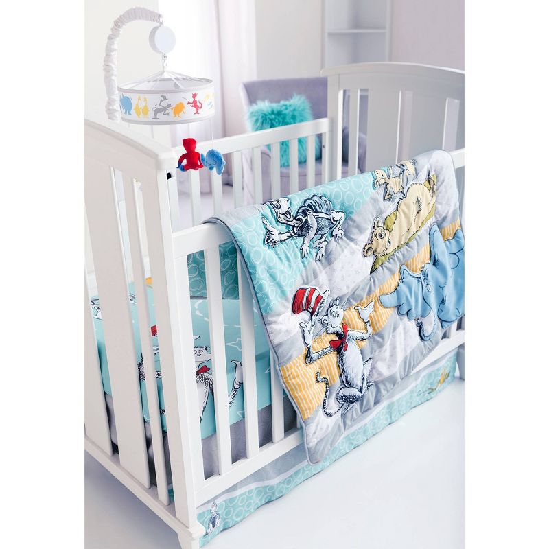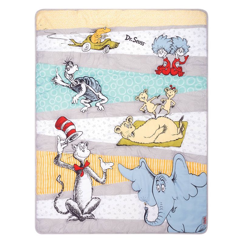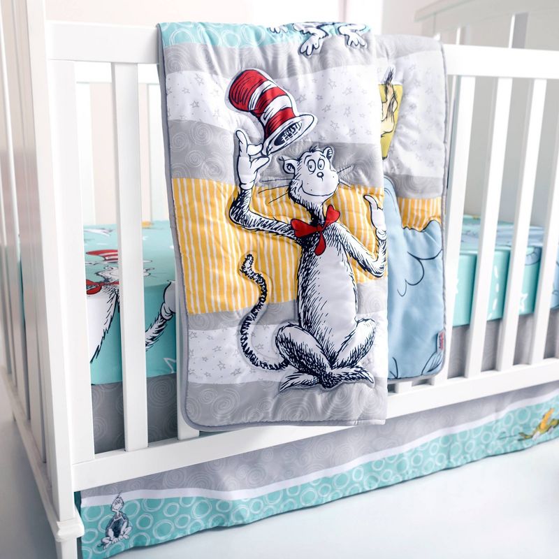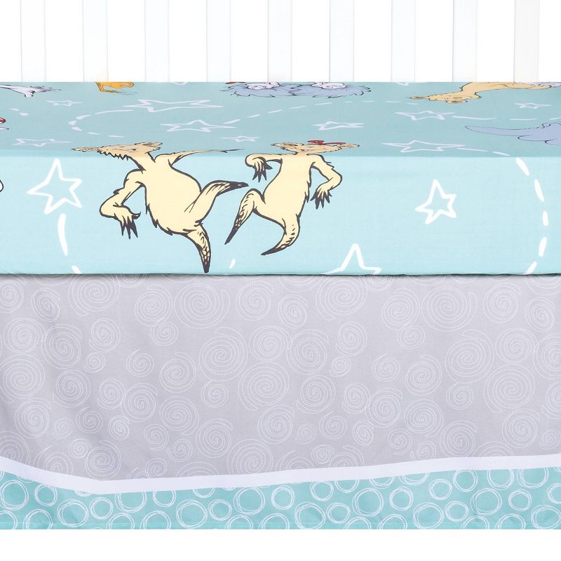 Join in on the fun with the Dr. Seuss Book Club 4 Piece Crib Bedding Set! All of your favorite Dr. Seuss characters including Cat in the Hat, Horton, Hop on Pop, Yertle, Thing 1 and Thing 2, and One Fish are highlighted with a dot print, stars, swirls, sketchy circles and stripes in a bold color palette of light yellow, light blue, red, aqua and gray. Add the perfect touch of fun to your nursery with this gender-neutral collection!. Please adhere to JPMA’s Safe Infant Bedding Practices. Product sold under license from Dr. Seuss Enterprises, L.P. Crib Skirt fits standard crib mattress 28 in x 52 in with 14 inch drop and features a swirl gray and white print top and a sketchy circles print bottom with One Fish and Yertle in the corners. Fitted Microfiber Crib Sheet fits standard crib mattress 28 in x 52 in with 8 inch deep pockets and is fully elasticized for a secure fit. Features characters peeking in to create the perfect photo op. Fleece Blanket measures 30in x 40 in and features a Horton applique in the corner.