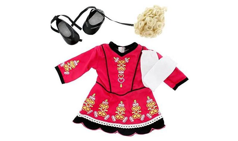 Dress Along Dolly's Irish step dancing outfit for American Girl dolls and all other 18 inch dolls. This doll outfit set includes a traditional red Irish dance dress, step shoes, socks and curly blonde hair wig. Everything you need to get your doll dancing! Compatible with all 18 inch dolls.