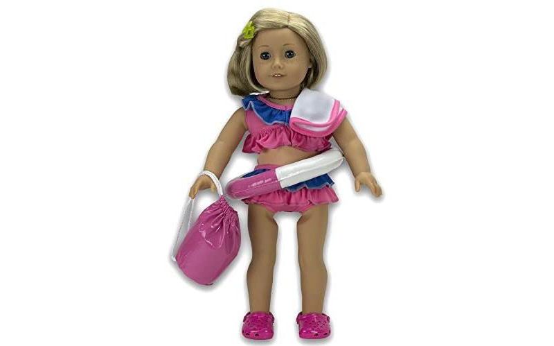 Swimsuit Doll Outfit for American Girl & 18" Dolls (6 Piece Set) - Beach Pool Clothes Includes Bathing Suit, Life Preserver, Towel, Bag, & Sandals -- Doll Clothes for American Girl Dolls: 6 Piece "Summer Fun" Beach and Pool Outfit - By "Dress Along Dolly" (Includes 2 Piece Bathing Suit, Life Preserver, Towel, Pool Bag, Sandals): From the makers of the best selling Ride Along Dolly Bike Seat comes a line of doll clothes that will make your favorite American Girl or comparably sized dolls' heart melt. Dress Along Dolly Clothes are all hand made, and custom designed to give your doll the unique look that you want. You won't find these clothes in any store. These are truly unique designs exclusive to Dress Along Dolly. Show off your doll in style. Fits any standard doll of approximately 18" in height, including American Girl Dolls.