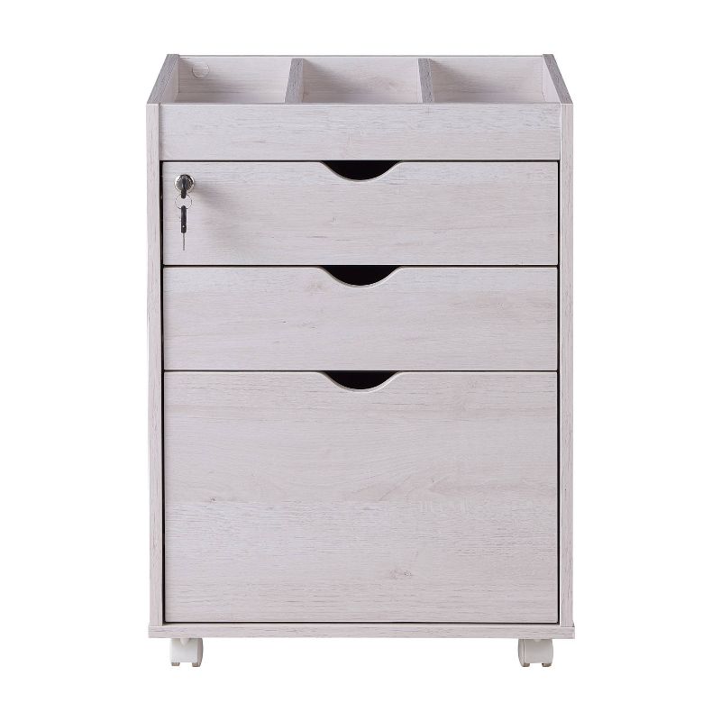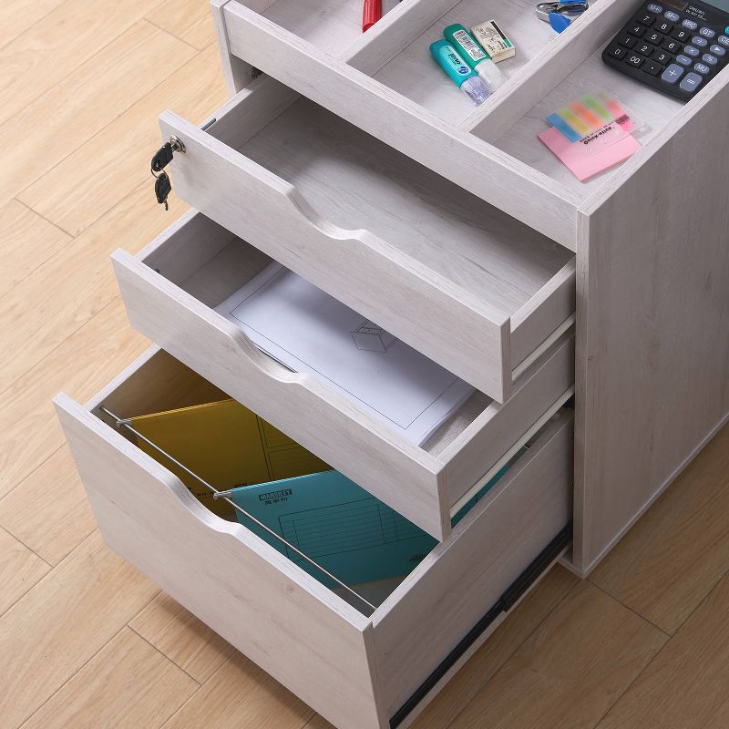 This minimalist rolling file cabinet is an ideal solution for keeping your business, work, and personal office supplies and files all in one place and secure. It has 2 upper drawers and a large bottom drawer to keep different sized hanging files folders organized. 1 key locks all 3 drawers for security. The 28" height allows it to fit under most office desks and locking casters allows it to move around freely. Store all your things and stay organized in any environment with this reliable multi-use filing cabinet.