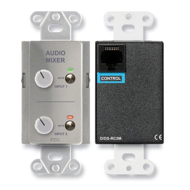 The D-RC type remote audio mixing controls provide user-accessible volume knobs for two or three sources. Each control is available with level controls only, or with level controls plus a muting button for each channel. They function exactly as a mixer without the need to send audio to and from the remote location. A rear-panel RJ45 jack provides the connection for standard twisted-pair wiring between the remote control and an RDL remote-controlled mixer. The cable sends the knob position and muting status data to the mixer. All audio signals remain local to the mixer which uses VCA technology to set the mixer levels. A long life 10 kΩ potentiometer is used in the control for setting the VCA voltage. Muting models provide a MUTE button for each mixer channel that alternately mutes or un-mutes the audio. An LED MUTE indicator glows red when the signal is muted and turns green when the audio channel is active. Each model is offered in a standard RDL white front panel or in stainless steel with custom lettering available. These finishes match other RDL remote selectors and jack plates for a visually appealing installation of multiple controls.