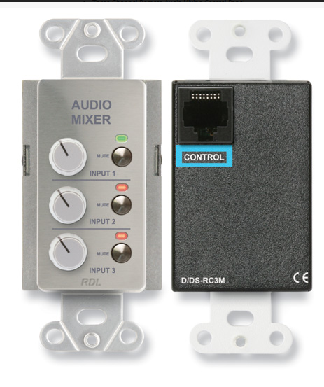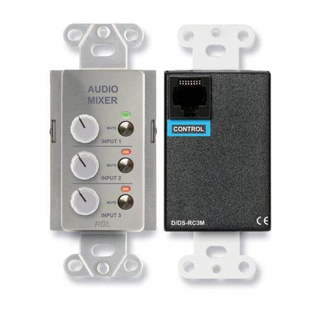 The RDL DS-RC3M Audio Mixing Remote Control is a single-gang wall or panel mountable, 3-channel mixing control unit for RDL mixers and PA amplifiers with an RJ45 connection. The DS-RC3M simply features 3 volume control dials for remote level control over a remotely locates VCA mixer, set of PA amplifiers, etc. The connection is made via standard RJ45 cable and the box is mounted into flat panels, single-gang electrical boxes, sheet-rock, etc. Some applications include commercial audio installations in retail, restaurants, bars, offices, high-end home theater applications, etc. Three Channel Remote Audio Mixing Control PanelMute switched per channelSingle-Turn Rotary ControlsSingle Control LocationAvailable in RDL White/Gray or Stainless SteelDirect Control of RDL Mixers with an RJ45 Remote Control PortStandard Twisted Pair Interconnection to Mixer