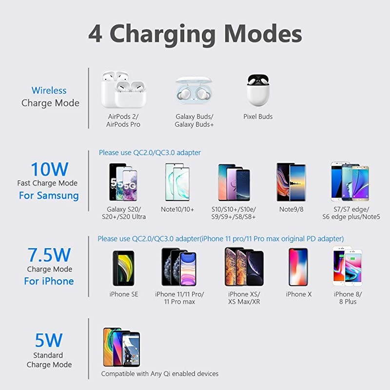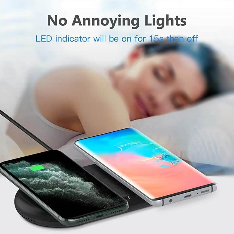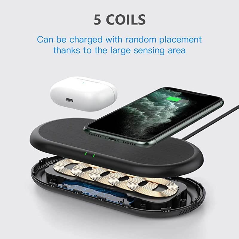 *****[2 IN 1 DESIGN]: 2 in 1 design, can charge two mobile phones at the same time with high-speed, or one mobile phone and one AirPods (with wireless charging case) / AirPods Pro, Galaxy buds, Pixel buds, simultaneously, or they can work separately.