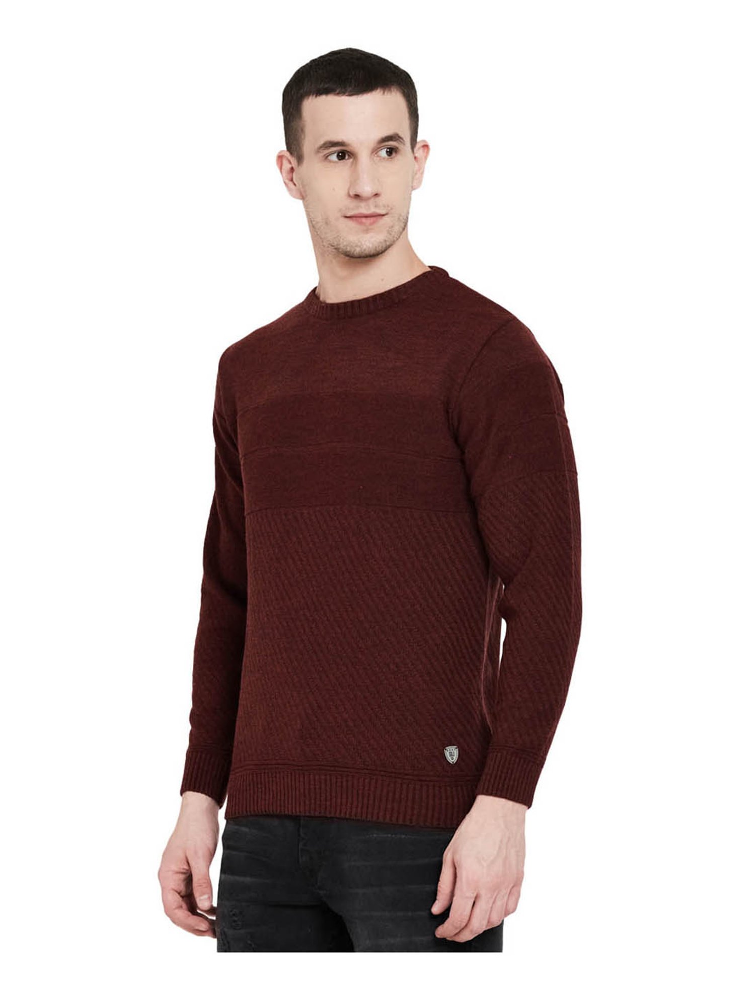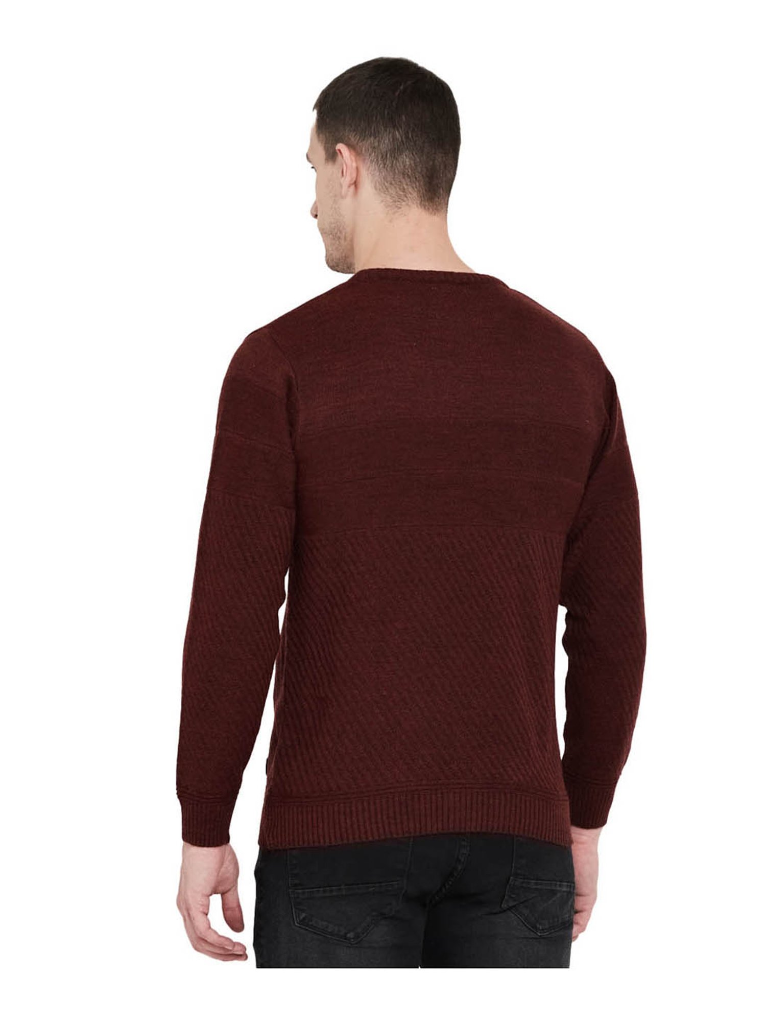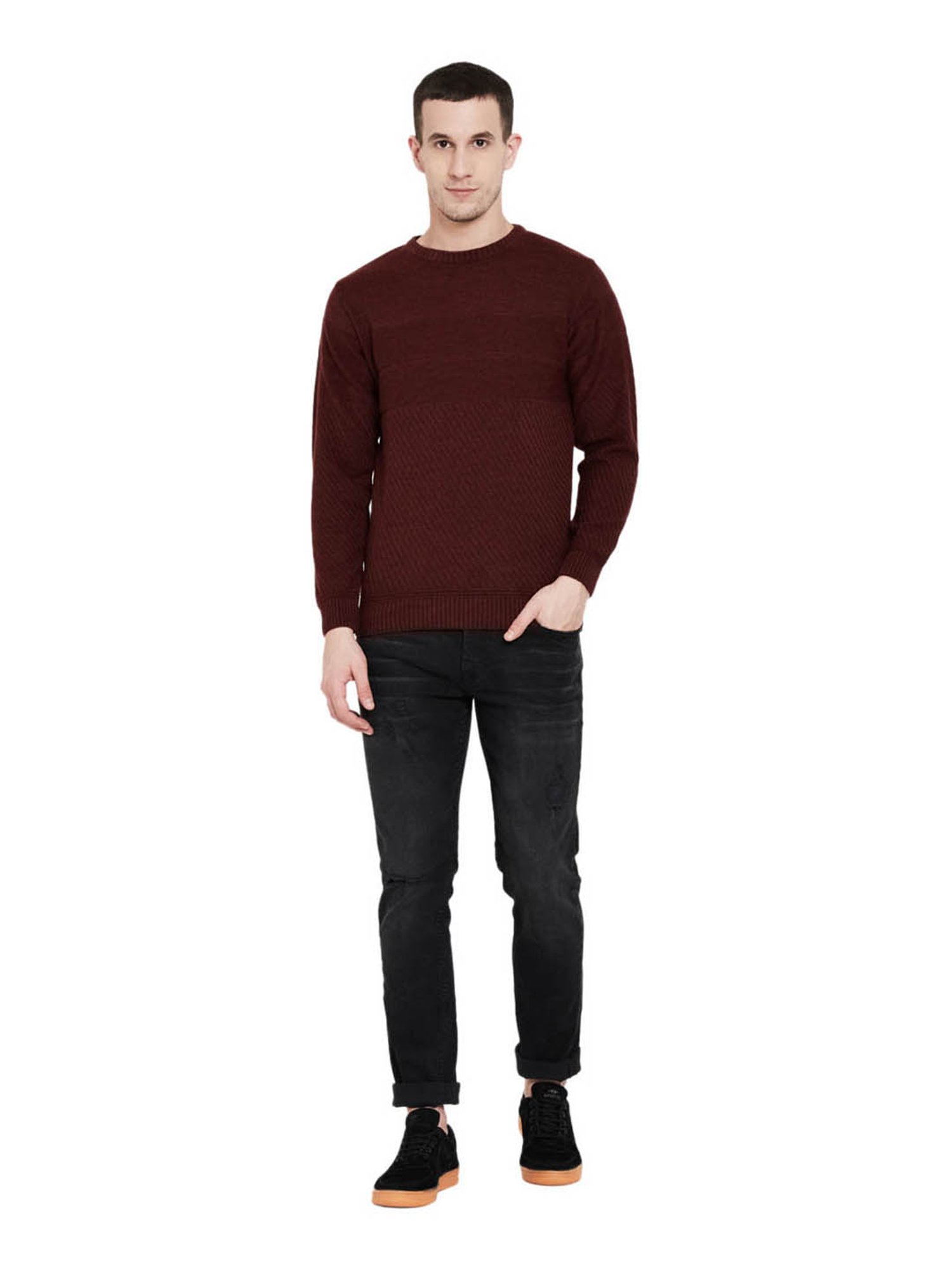 Add fun to your casual collection with this wine sweater from Duke. This sweater will ensure day long comfort, courtesy to its wool fabric. This regular fit sweater features a classy round neck, full sleeves and self striped pattern. Team this sweater with a distressed jeans or trousers for a relaxed look.