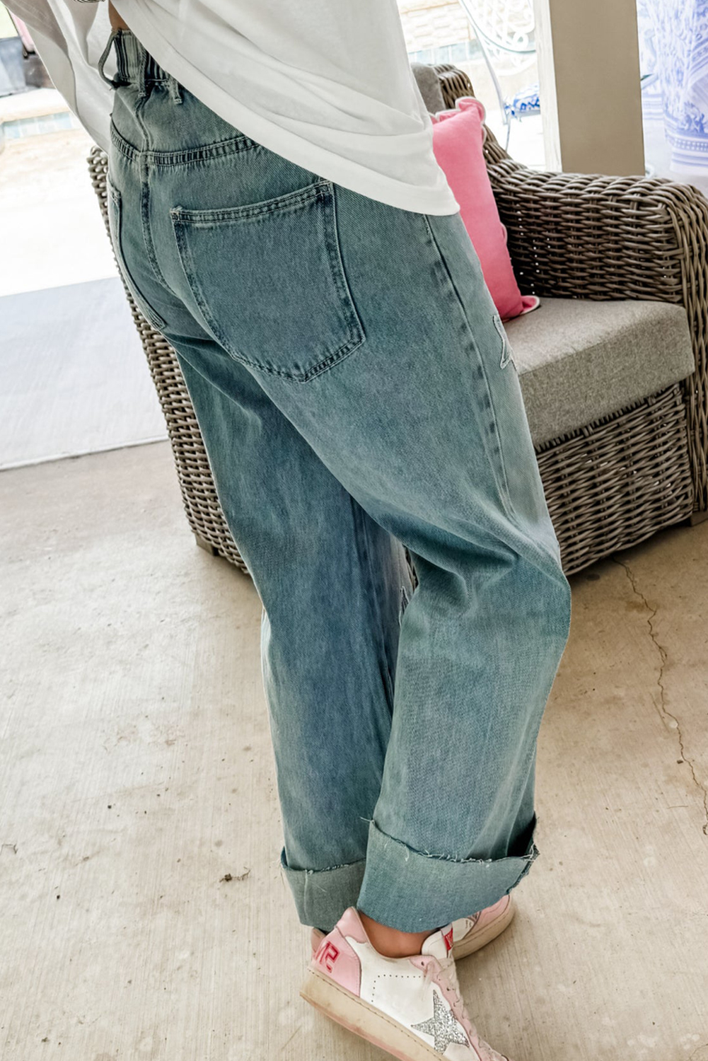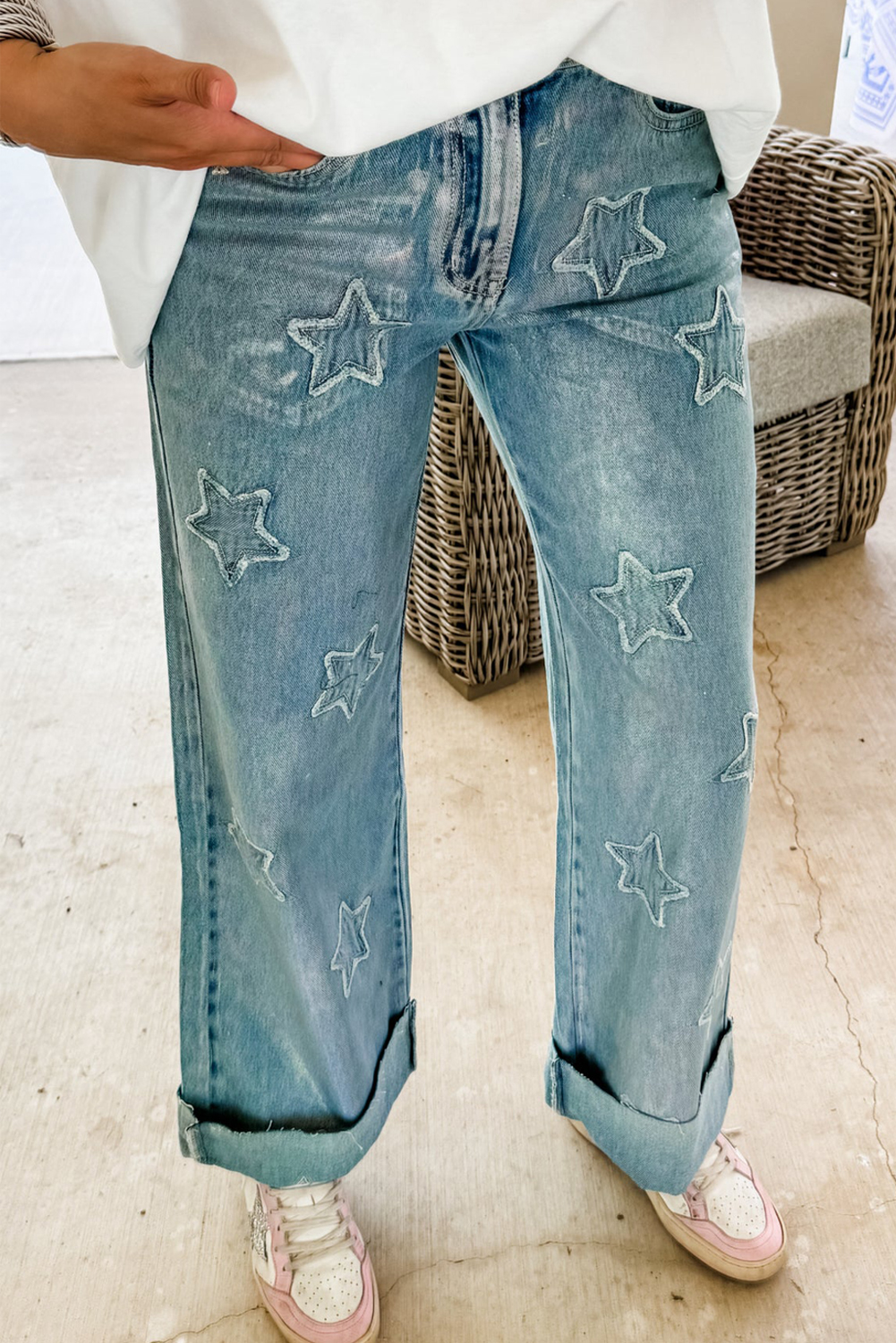 • Crafted with intricate star patches, these jeans add a playful touch to your outfit, making them a versatile choice for day or night.