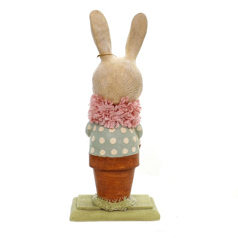 A Large 12.00 Inch Tall Cream Rabbit With Big Eyes In A Terra Cotta Planter. The Eyed Rabbit Wears A Pale Blue And White Polka-Dot Top With Big Pink Buttons And Carries A Carrot Basket. A Shredded Crepe Paper Collar Completes The Figurine.. New. Measurements 12.00 In H X 5.25 In W X 3.00 In D. . Made Of Polyresin. No Assembly Required. Indoor Use Only. Imported