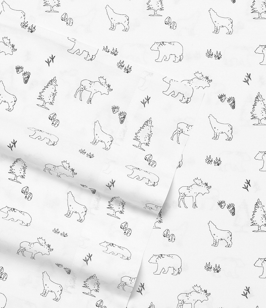 - Features graphic representation of a bear, wolf, moose, trees, and animals tracks motif
