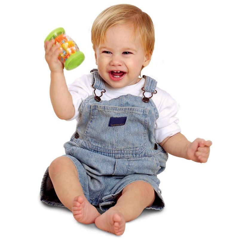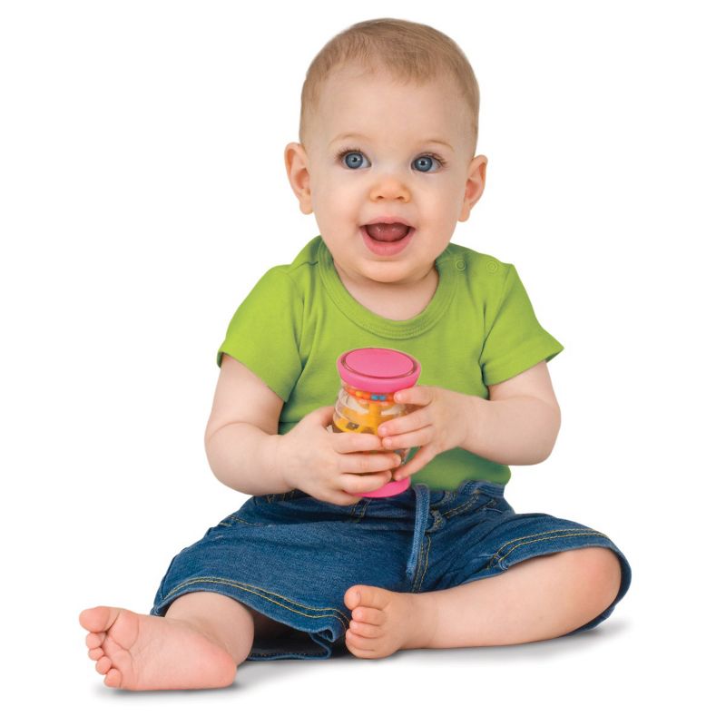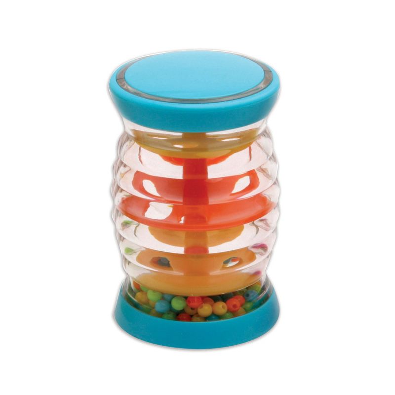 3 months & up. Introduce your little to the magic of sound with this colorful set of shakers! A simple turn creates a combination of sound and color that will captivate inquisitive minds. Watch and listen as a rainbow of colored beads cascade through the tube recreate the gentle sound of falling rain. Measures approximately 4" in height.