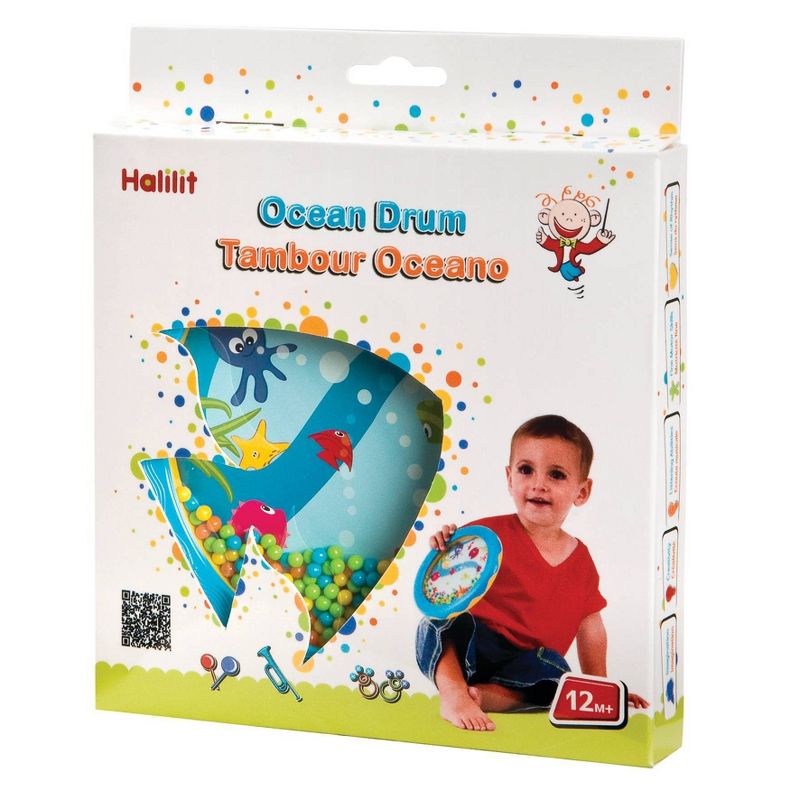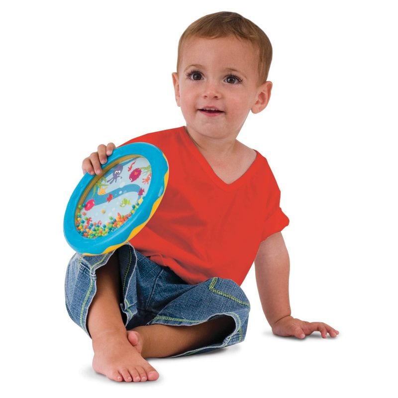 Create gentle, soothing ocean music with this hand held drum engaging children's auditory and tactile senses. This drum also stimulates children visually with its see through aquatic themed background and its bright colors. This accurately tuned drum keeps babies engaged with the exciting sounds while they also develop hand-eye coordination and fine and gross motor skills. It is 7" in diameter.