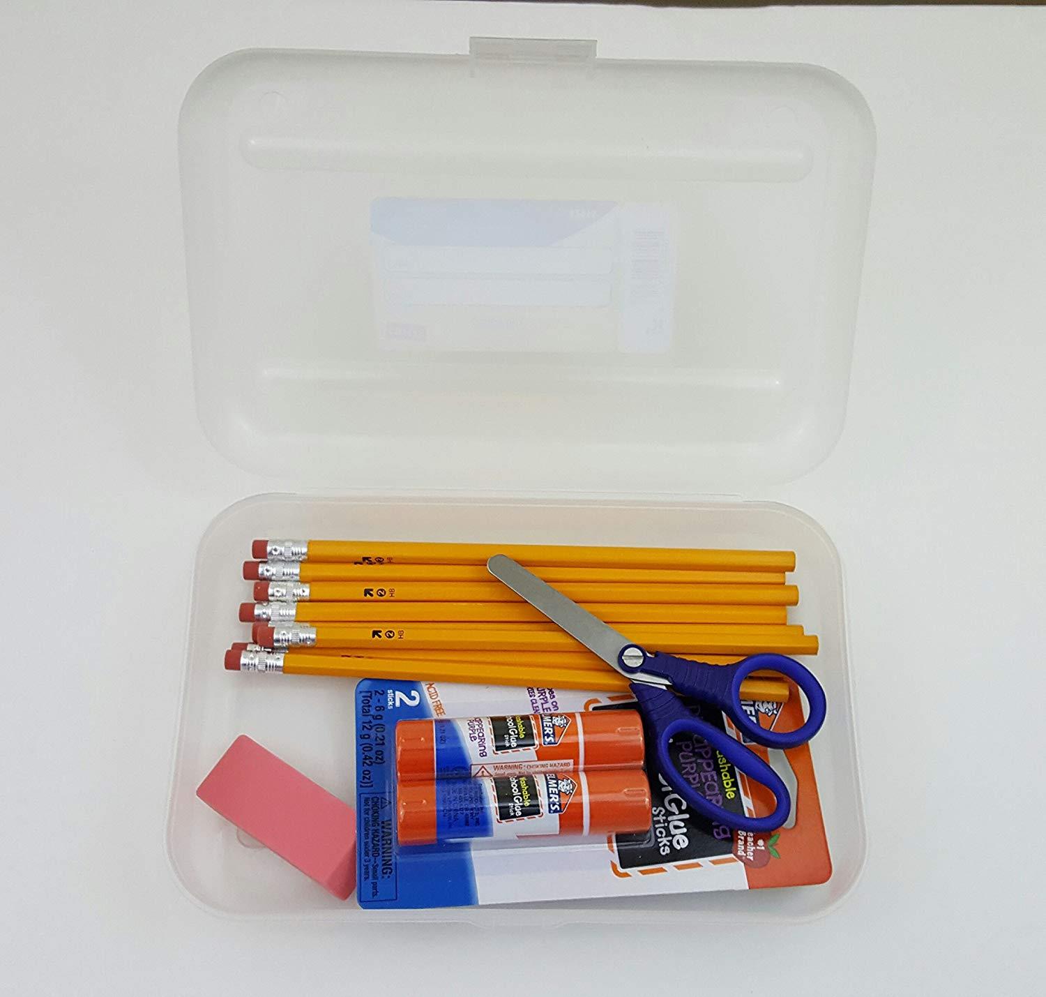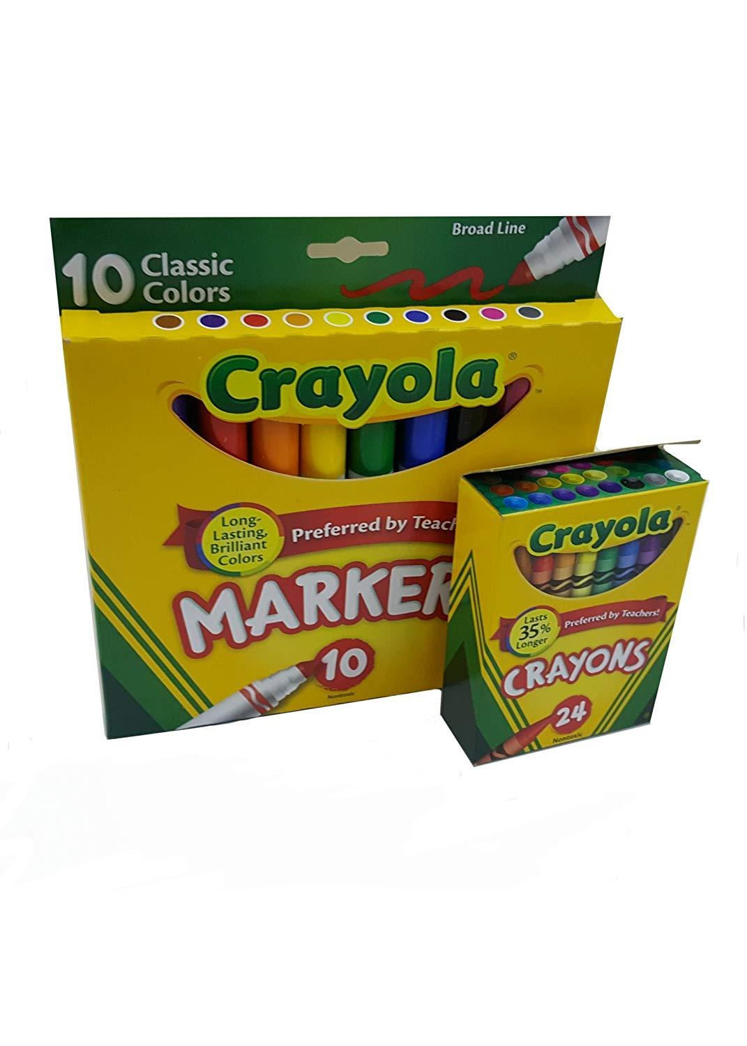 Contains: 4 wide rule spirals, 2 paper folders, 1 pink eraser, 1 scissor, 1 ruler, 2 glue sticks, 1 liquid glue, 1 pack of Crayola markers, 1 pack of Crayola crayons, 1 pencil box, 8 #2 pencils