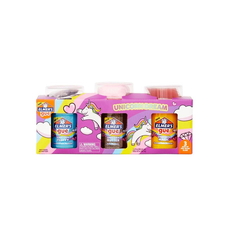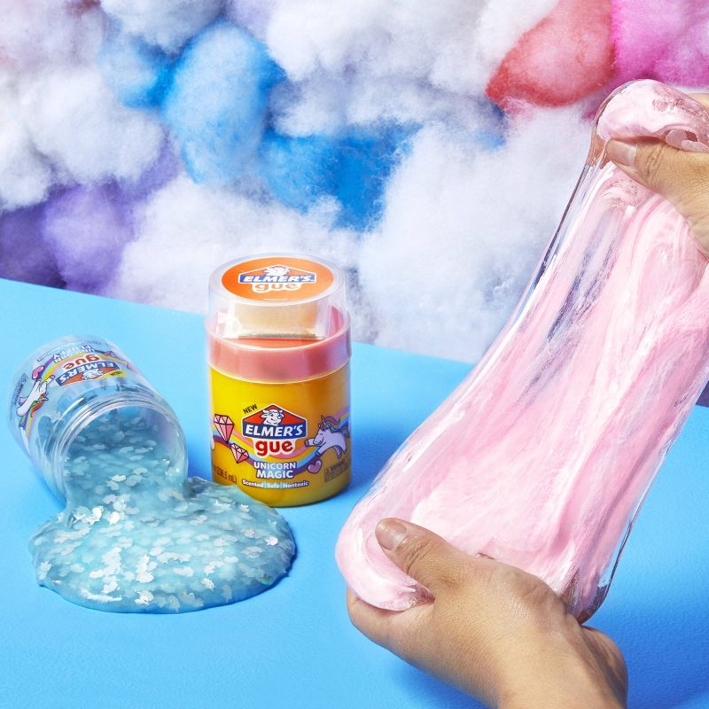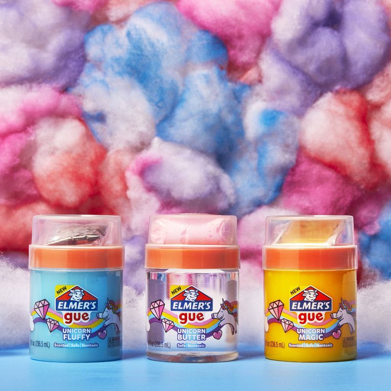 Fly into fun with the Elmer’s Gue Unicorn Dream Variety Pack! It’s a trip to a land full of wonder with 3 types of premade slime inspired by magical unicorns. Each jar of slime comes with its own set of unique mix-ins that transform the slime’s texture and add fun effects. Inside you’ll find a jar each of Unicorn Magic Gue (includes gold foil that shimmers when added to slime), Unicorn Butter Gue (includes pink clay that transforms Gue to smooth butter slime), and Unicorn Fluff Gue (comes with confetti that adds a sparkle when mixed into slime).