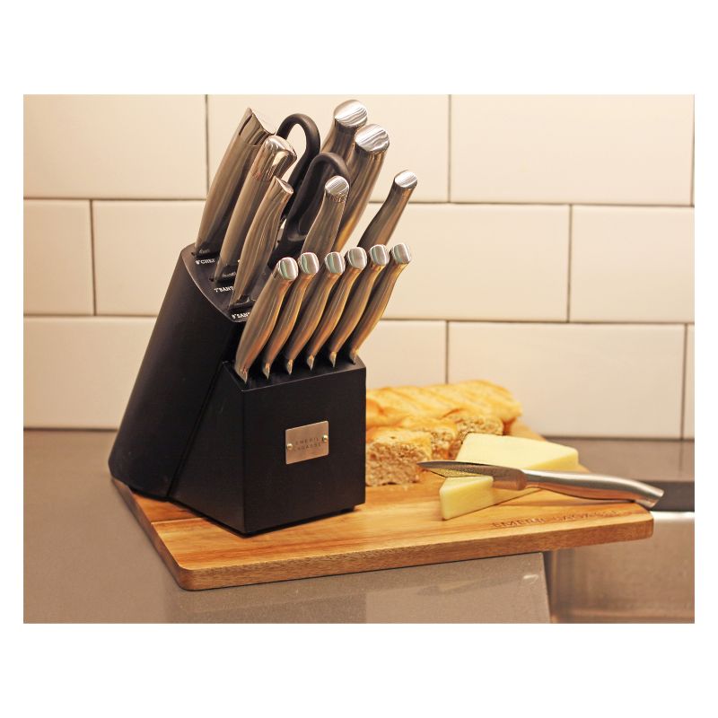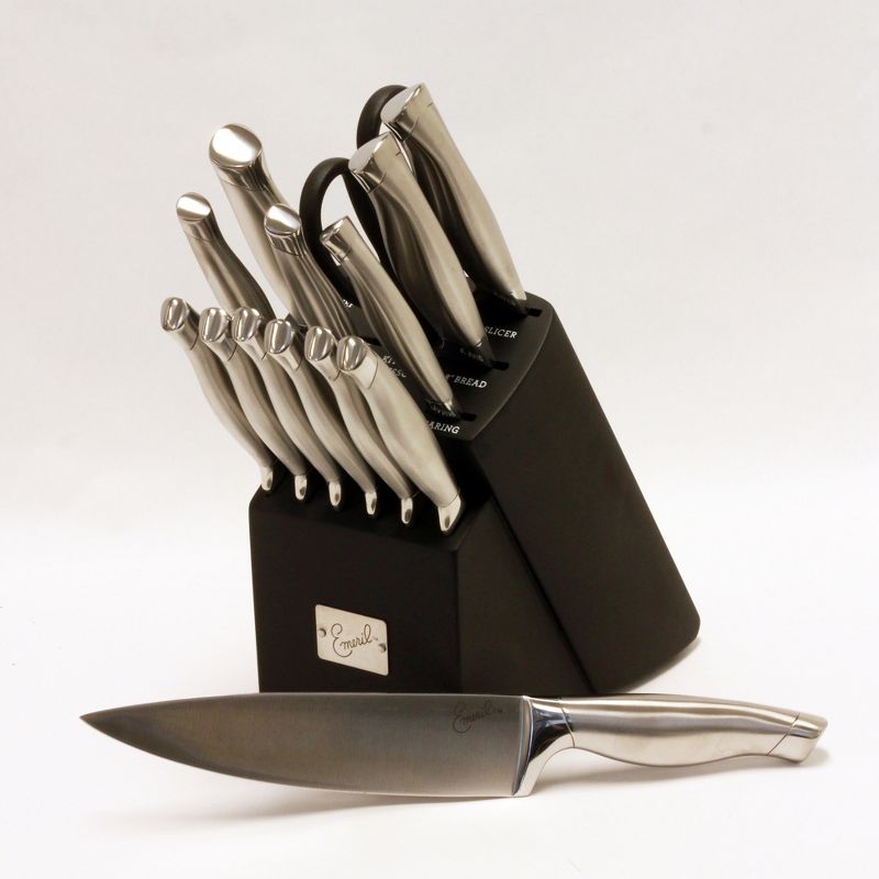 Nestled inside of an Emeril-approved handsome rubberwood storage block is a dynamic set of kitchen knives and shears. Each was made with an ergonomic design so that they are comfortable to use while slicing and dicing. When cooking and cleanup are done, the knife block has labeled slots for each piece of the set. Set includes: - 8" chef's knife