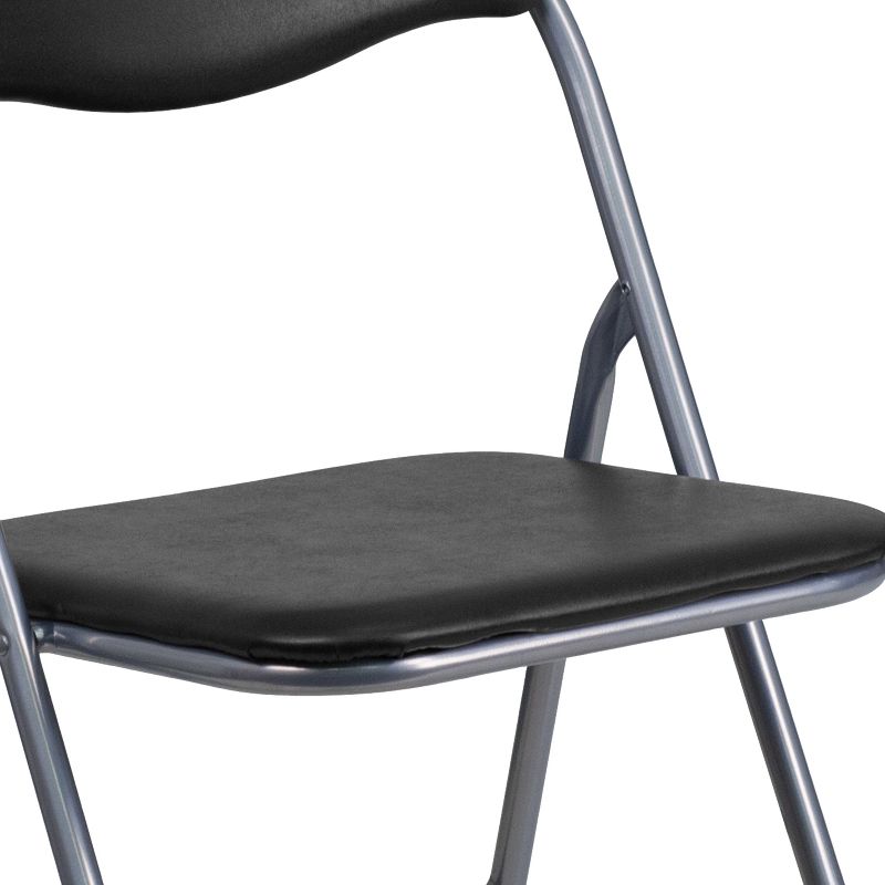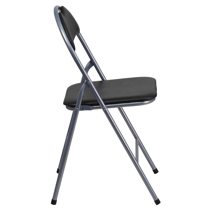 This is not your traditional metal folding chair this chair offers style with its open back design and modern appealing silver powder coated frame finish. Built for the commercial industry, these double braced metal chairs hold up to 300 lbs. This portable chair has a carrying handle to make transporting much easier when storing. No longer be unprepared when guests show up at your front door for an impromptu visit when you can pull these upholstered folding chairs from storage or closet. These chairs fold compactly with a depth of 1.75" they are ideal in homes and businesses where space is an issue. The vinyl upholstery is easy to clean after you've invited everyone over to feast. Minimize the foot traffic in your home by hosting an outdoor gathering while taking advantage of the good weather or so people don't congregate inside your living room. Store these chairs indoors to protect the frames. These padded folding chairs come fully assembled to be of service upon delivery. Additional Features: Carrying Handle Cutout for easy movement, Designed for Commercial or Residential Use, Folded Size: 17"W x 1.75"D x 35.75"H, Top Review: I purchased these chairs for a business studio and am very pleased with the quality for the price. They are light but not flimsy and are nicely padded on the seat and back..