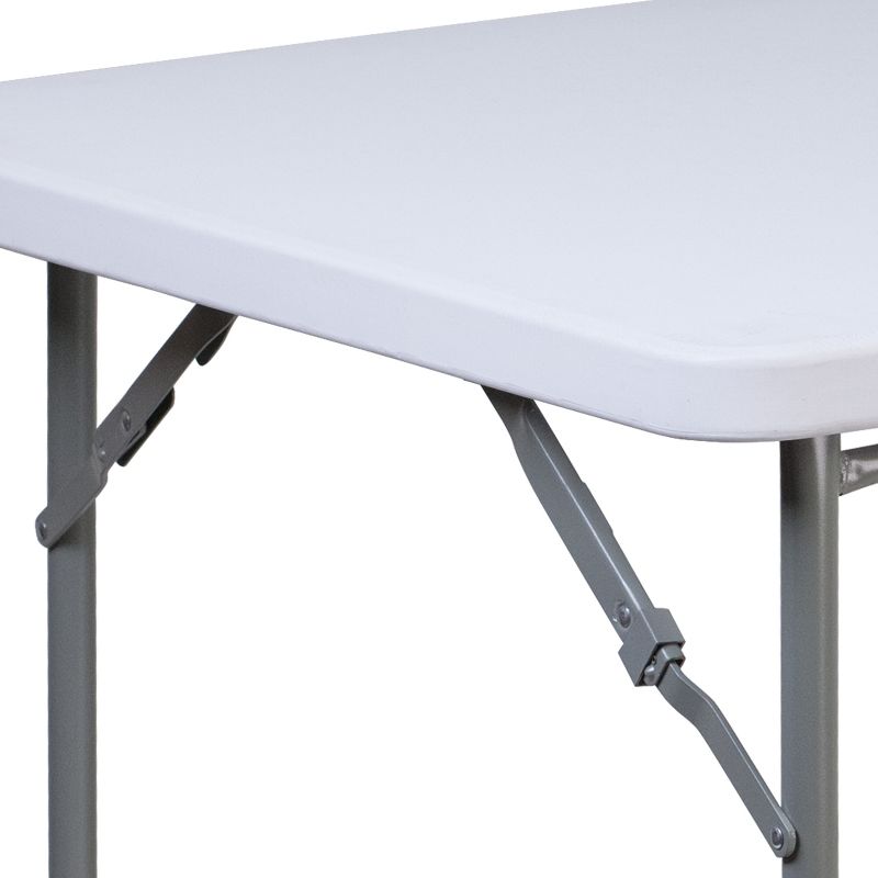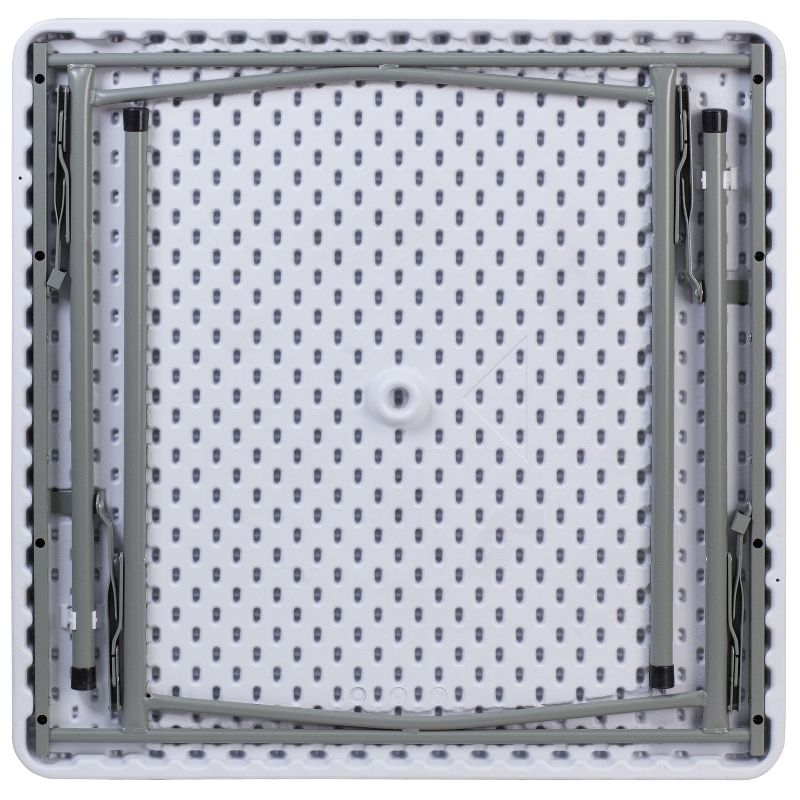 It's game time when you pull this folding table out. This square plastic folding table is the perfect game table to seat 4 people for card and board games. This compact table can serve multiple uses in the hospitality industry, business offices and in the home to seat extra people or hold plates, napkins and cups during gatherings. Dine outdoors on the deck to enjoy the summer breeze, this table sets up in no time. This mini table travels well for people who live on the road in vans, campers and RVs. When you're ready to put away the legs lock underneath the top to be stored away. Enjoy this portable table inside or outside but always store indoors to protect the frame from extreme moisture. Additional Features: Gray Powder Coated Locking Legs with protective floor caps.