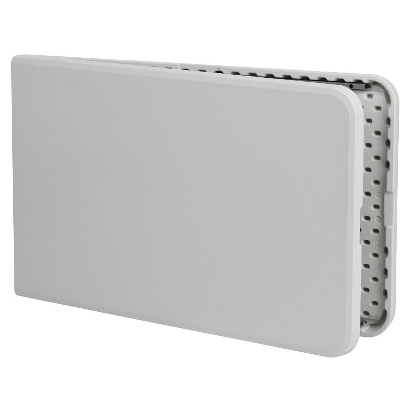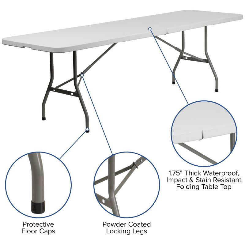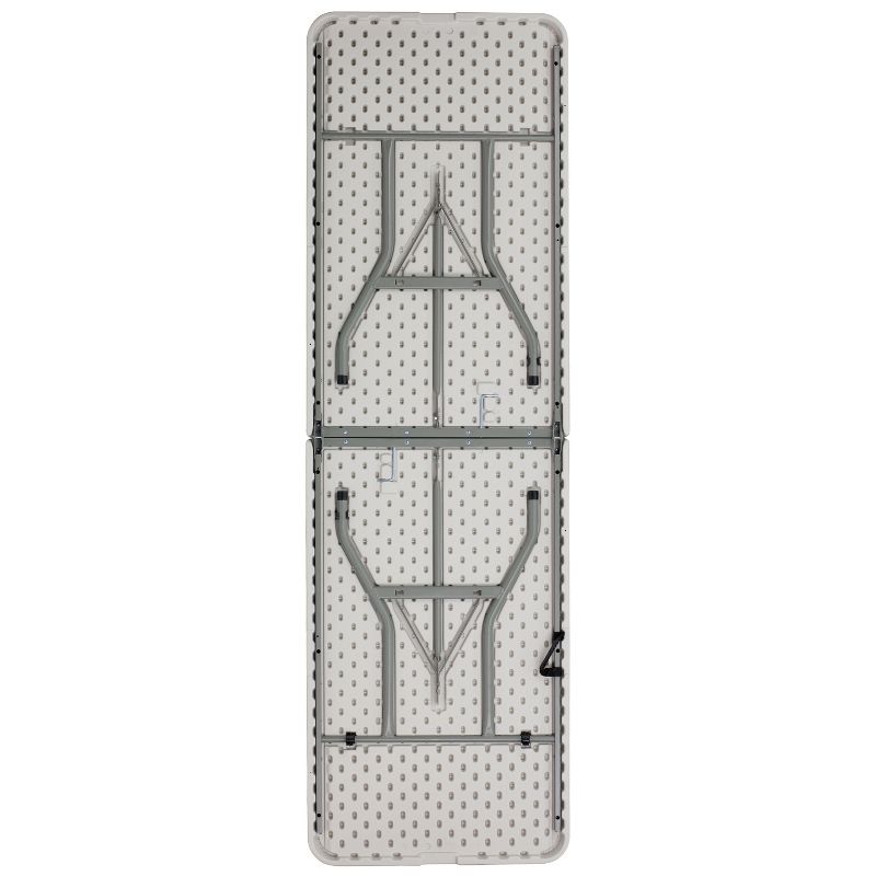 If you attend trade shows and have catalogs and products to display this portable folding table with carrying handle will make your life a little easier. Have your table standout at expos by draping a floor length table cover over the table and offering sweets to engage people as they walk by. After events the legs lock into place underneath the top and folds in half to transport with less effort. Be unbothered when your relatives invite additional friends to the barbecue, you'll have plenty of space on this 8' long centerfold table. This event folding table accommodates up to 10 adults to throw big birthday parties and host baby showers. This ready to use table is commercial grade and is often used in restaurants, warehouses, schools, churches and recreation centers. Event rental venues keep rectangle folding tables on the premises as they are the most used to accommodate parties of all sizes. Rectangular tables can be arranged to create a u-shape to allow space for a dance floor. Easy to clean and store, plastic folding tables are the best and most popular option for any occasion. Although designed for indoor events this party table can be used outdoors on the deck or patio during good weather. Store the table indoors and protect the frame from extreme moisture. Invite everyone to the celebration when you have this 30x96 plastic folding table readily available at your home or business. Additional Features: Folds in half for storage and travel, Includes convenient carrying handle, Gray Powder Coated Locking Legs with protective floor caps.
