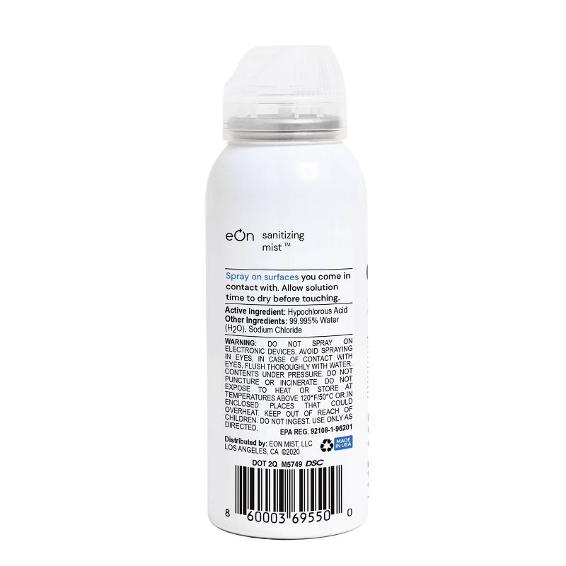 Hypochlorous acid (HOCI) is one of the most effective known biocides produced by the human immune system. HOCI is now used in healthcare, food safety, water treatment, and general sanitation world-wide. HOCI’s chlorine based odor does not linger and rapidly dissipates. eOn Sanitizing Mist is an EPA registered personal protection product which can rapidly neutralize easily transmitted pathogens via HOCI. eOn Sanitizing Mist Eliminates 99.9% of bacteria and viruses. Spray on surfaces you come in contact with.