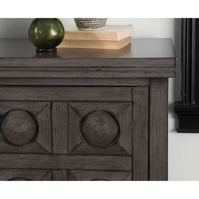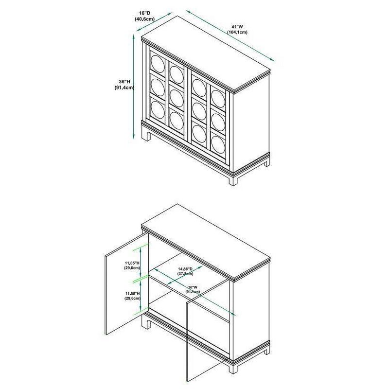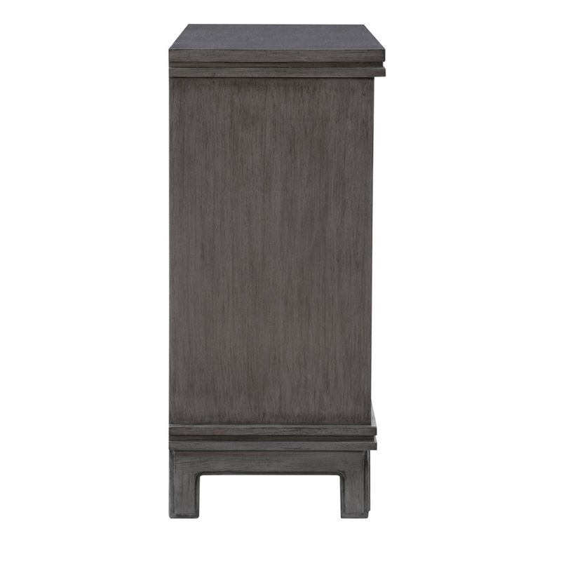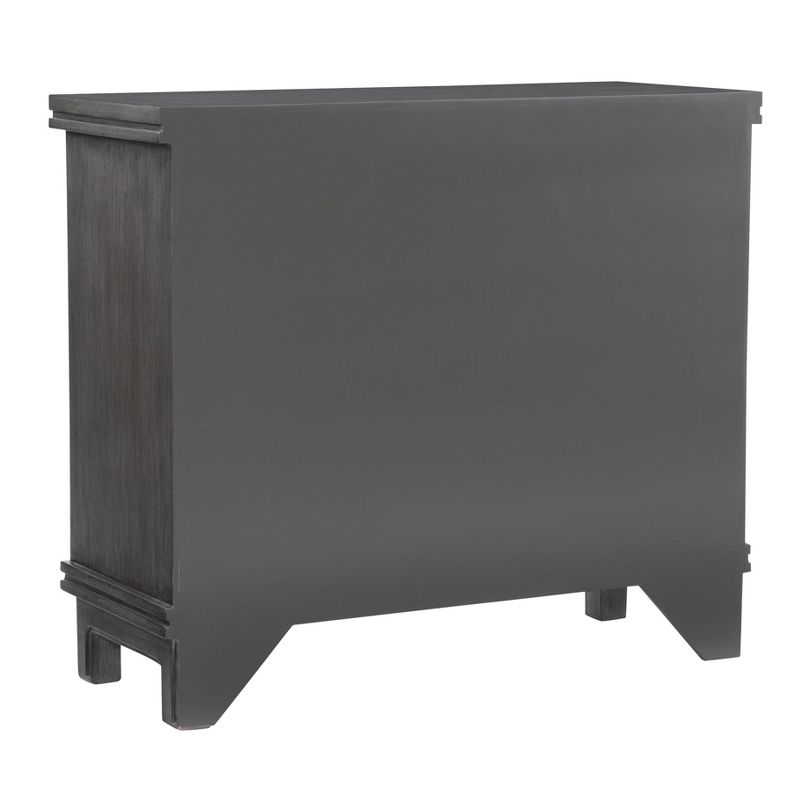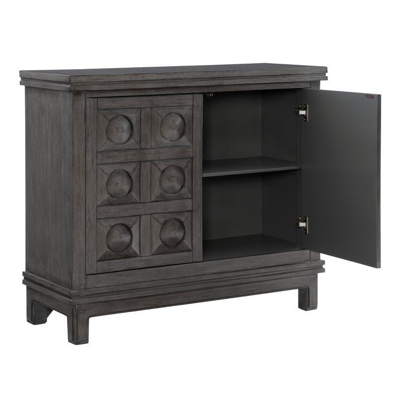 Dramatic raised and dimensional door fronts set this storage cabinet apart. In a rich, multi-step gray finish that provides an anchor piece for any room. Two large doors on hidden euro hinges, open to revel a fully finished storage area with a fixed shelf. Arrives fully assembled and ready to impress in a living room, dining room or entryway.
