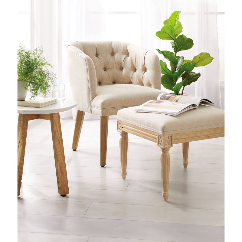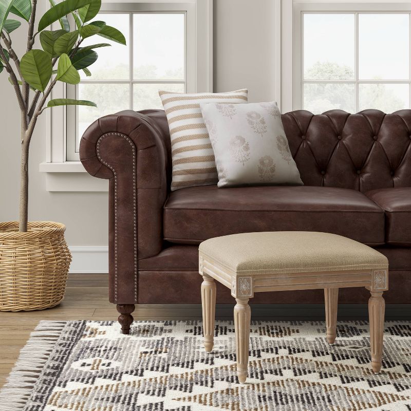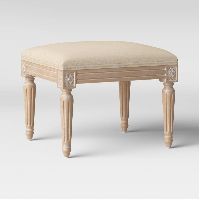 Enliven your decor with the Erwin Turned Wood Leg Ottoman by Thresholdâ„¢. Featuring a cushioned top wrapped in soft fabric upholstery with a stunning turned-wood frame, this upholstered sectional bench offers you a perfect blend of contemporary style and laid-back comfort. The upholstered top offers a comfy and stylish seating space, while the solid wooden frame provides a durable and elegant construction. Whether kept in the entryway as a spot to rest while you put on your shoes or used as an extra seating space when you have guests, this upholstered ottoman can easily be paired with other furniture like the couch to provide inviting seating space for you and your guests.