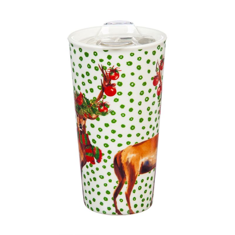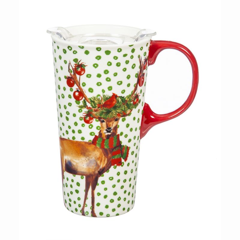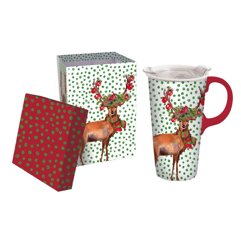 This 17oz. ceramic travel cup comes with a slide closure Tritan lid and a matching gift box perfect for Christmas. It has a red handle. The mug has green drawn circle pattern and a reindeer decorated in ornaments, scarf, a wreath and cardinal.