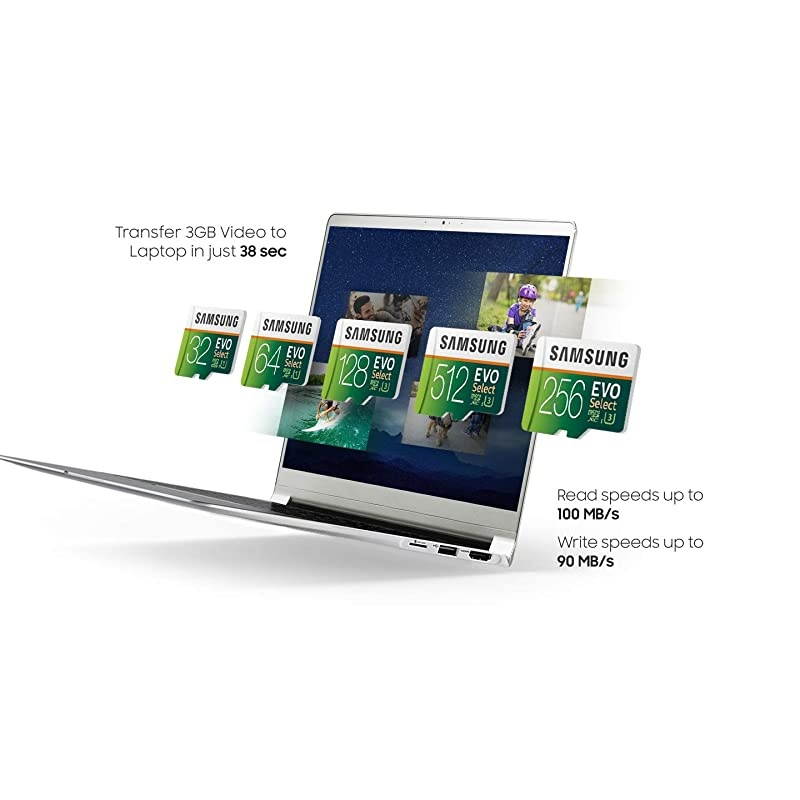 Capacity: 128GBWith stunning speed and reliability, the 512GB microSDXC EVO Select memory card lets you get the most out of your devices. Ultra-fast read & write speeds of up to 100MB/s & 90MB/s and backed by 4-proof protection, keep your data safe against water, extreme temperatures, and other harsh conditions. Feel confident to capture, store and transfer 4K UHD videos, photos, music and other large files effortlessly. Your memories and adventures are irreplaceable, and now unforgettable.