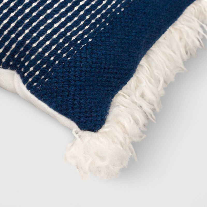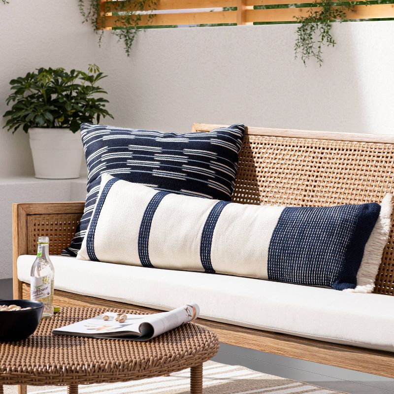 Lend a subtle touch of style to your space with this Extra Long Woven Lumbar Pillow DuraSeason Fabricâ„¢ from Thresholdâ„¢ designed with Studio McGee. This white throw pillow features a blue woven pattern for a classic look that adds sophisticated flair to your space. The textured finish adds timeless charm while the filled construction lends cushioned comfort. Use this extra long lumbar pillow on your sofa or couch to stay comfy while resting.