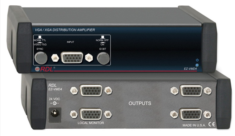 Input: VGA - QXGA RGBHV or RGB with combined sync Outputs (4): LOCAL MONITOR (1, Buffered, ID bit pass-thru to INPUT), OUTPUTS (3, buffered separately from LOCAL MONITOR) Gain: Unity Video bandwidth: > 470 MHz Video impedance: 75 Ω (Input and output) Sync (HV) input: 500 Ω TTL or 75 Ω Video (Switch-selectable), 0.7 V to 5 V p-p Sync (HV) output: 5V TTL Sync (HV) Propogation delay: < 4 nS typ. Sync (HV) Rise time: < 4 nS typ. Sync (combined): Output follows input Bit Control: Switch-selectable (Pin 4, over-rides LOCAL MONITOR jack ID bit pass-thru) 24 Vdc power supply current: 70 mA (idle), 90 mA (max.) Case dimensions: 5.75â€? (14.6 cm)W x 5â€? (12.7 cm)D Mounting size: 1/3 rack width