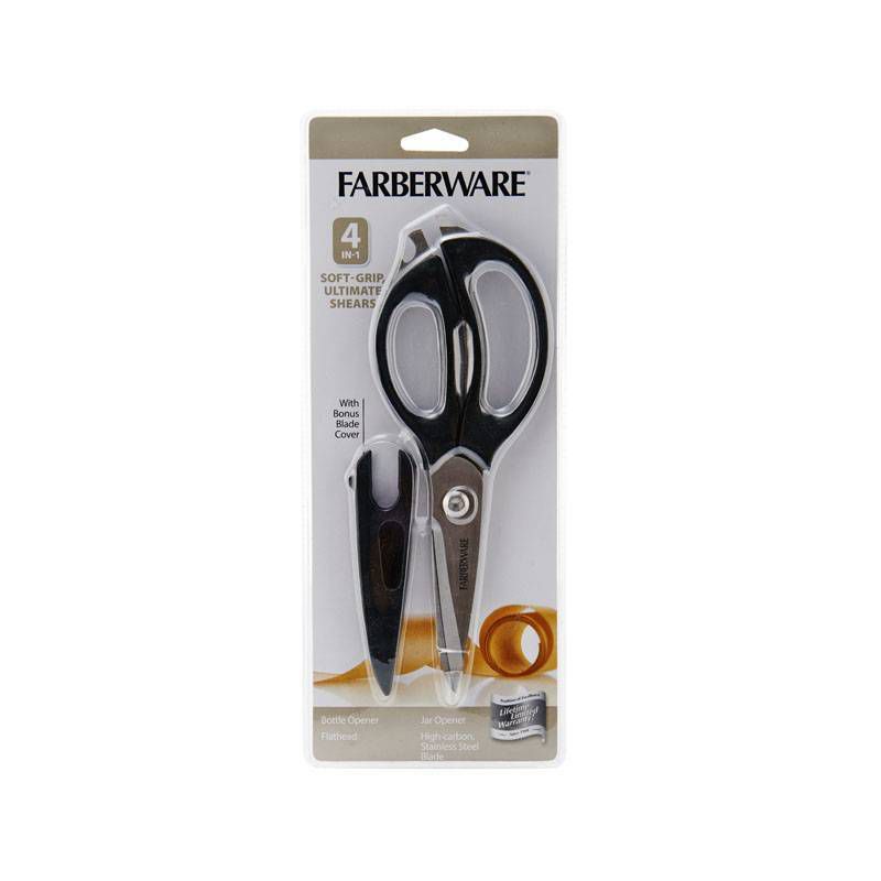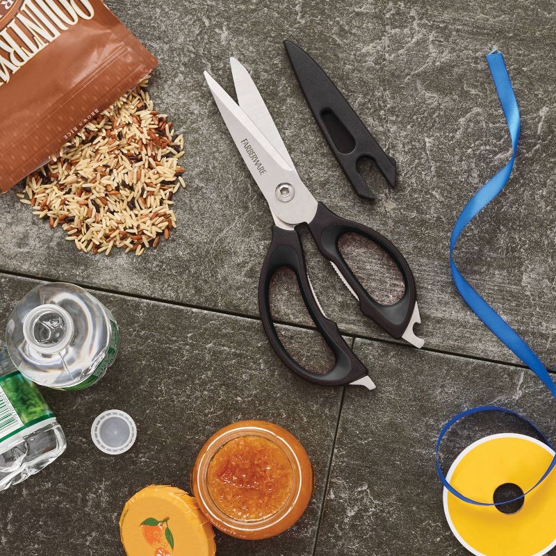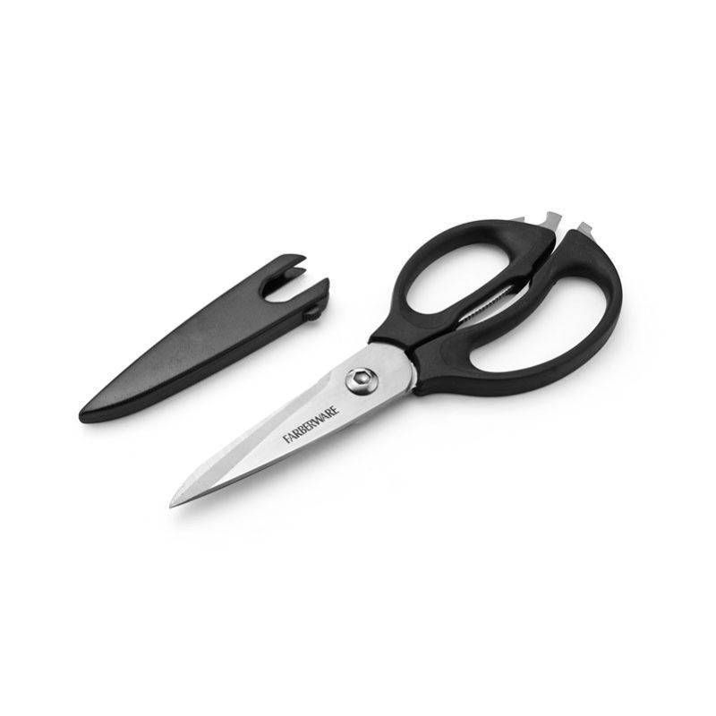 This multifunction shear also features the functionality of a jar opener, a flathead screwdriver, and a bottle opener. Handles feature a non-slip grip that provides a secure and comfortable grip while cutting. This pair of kitchen scissors eliminates the needs for multiple tools in the kitchen and saves precious drawer space. Featuring long lasting, ultra-sharp stainless steel blades, this pair of shears also includes a plastic blade sheath which provides safety to both you and the shears when it is not in use Hand-wash with warm water and a mild detergent - rinse and dry immediately; shears are not dishwasher safe.