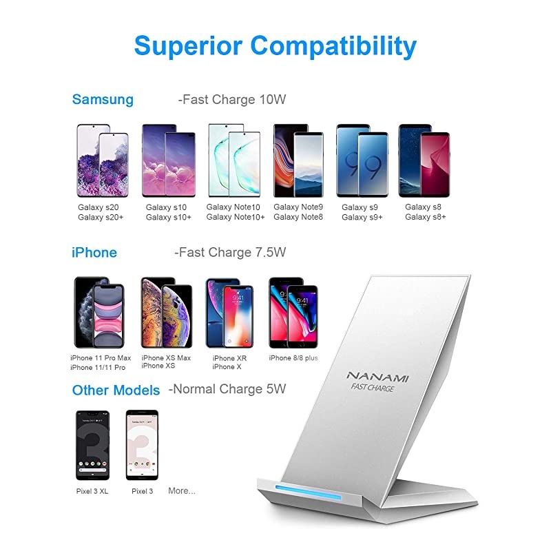 Fast Charge Model: Galaxy S20/S20+/S20 Ultra/S10/S10+/S10E/S9/S9+/S8/S8+/S7/S7 Edge/S6 Edge+ and Note 10/10+/9/8/5, required QC 2.0 or above adapter as its power source (Not Included); 7.5W