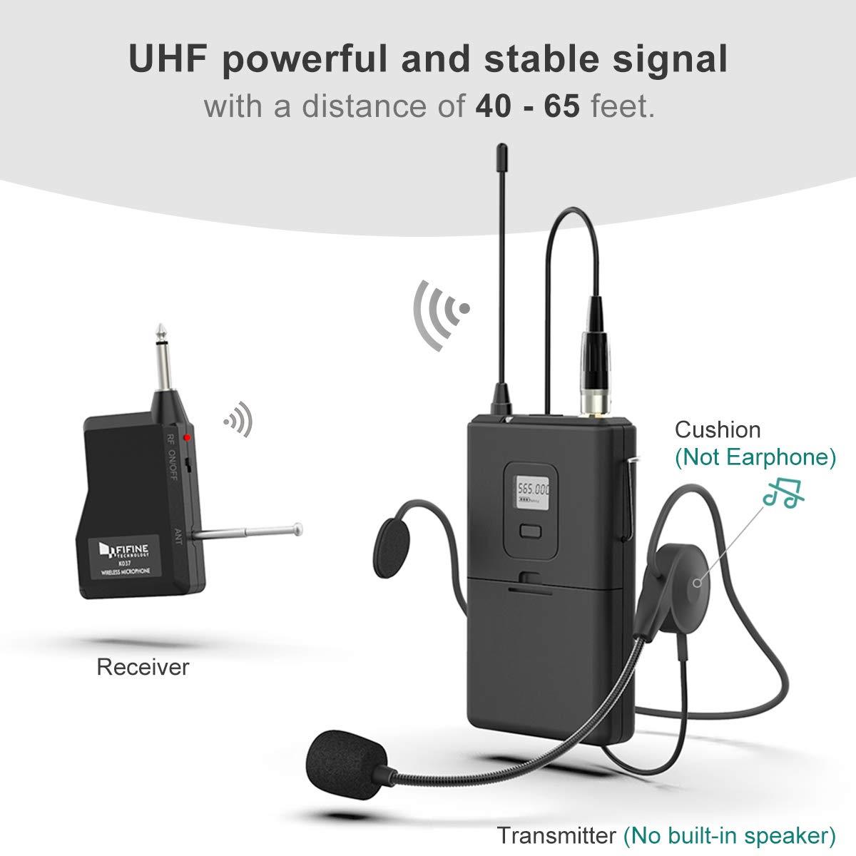 UHF Frequencies--The wireless lapel microphone system has 20 frequencies selection for seamless, interference-free operation.An easy-to-read LCD information display provides constant monitoring of system operation, Receiver battery condition indicators with low-battery warnings.Convenient and easy to use-- No static,no drop out with use at a distance of 40-65 feet.With paired ID synchronization for each wireless transmitter and receiver make setup easy.Setting up a wireless mic is as simple as plugging in a wired microphone.Wireless Headset and Lavalier--Headset microphone fits securely for active speakers and vocal performers.Lavalier microphone with included tie clip offers low visibility and hands-free use.optimized for Houses of Worship in a church preaching,YouTube videos,and classroom and presentation applications.Versatile and Compatible Microphone-Work with mixers, pa speakers, electric guitar amplifiers and sound boards with 1/4" interface to output the sound, ideal for teaching lectures,conference speech, visiting guide,recording flute.With included 1/4" to 1/8" adapter-cable, suit for camera equipped 3.5mm mic jack recording.What You Get--Wireless microphone set included headset microphone and Clip-on Lavalier Microphone Body pack Transmitter, Receiver with 1/4" Plug,Solid metal collar clip and windscreen reduces plosives, wind, and breath sounds.Female 1/4" to 1/8"Adapter Converter Cord.Please use our original lapel microphone which is equipped, it’s more compatible with the FIFINE wireless transmitter, and make the sound better.The figure given is only the approximate value that applies when there are no obstructions between the transmitter and receiver and they need to be in direct line of ‘sight’ for them to work.This distance will vary depending on metal objects, people and other obstructions and on the signal strength.Battery life may vary depending on the type of battery used.1.5V Alkaline batteries are recommended for wireless transmitter and receiver.