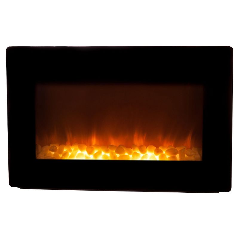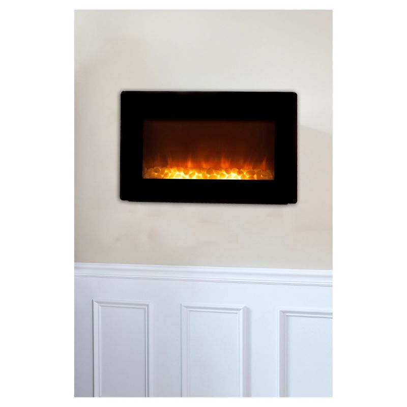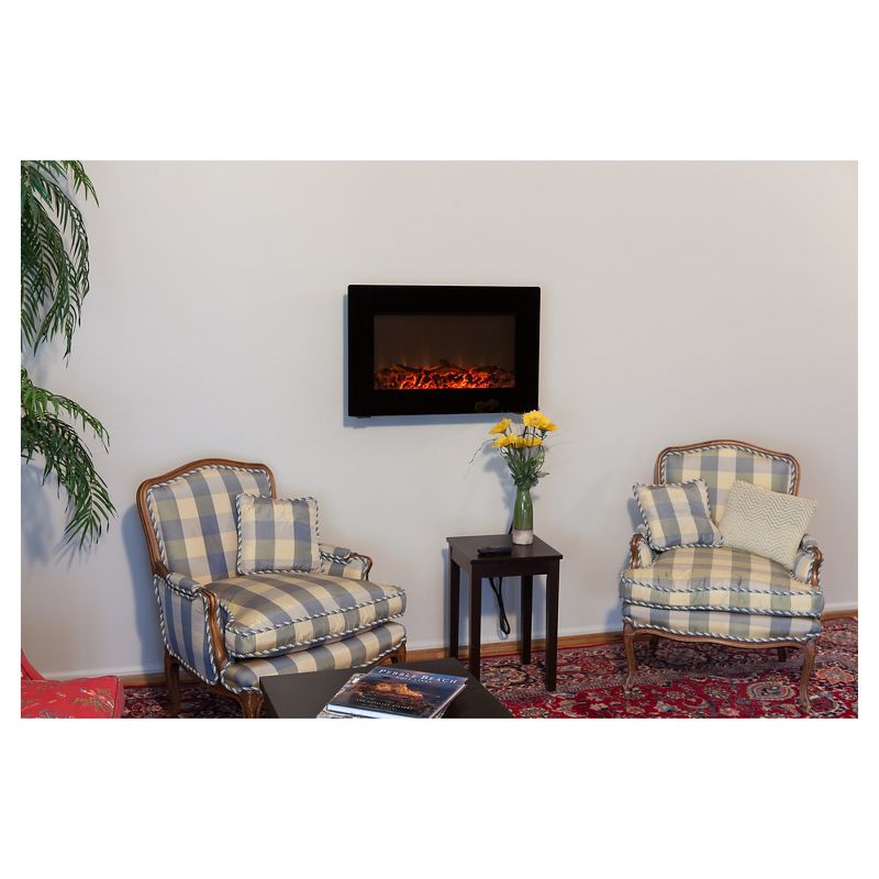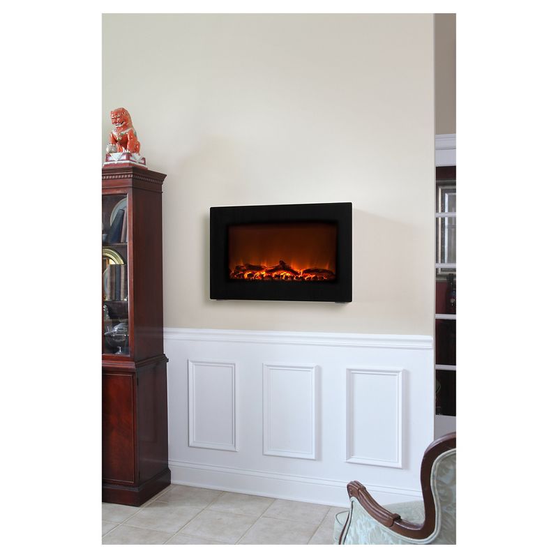 Add sophisticated ambience to any room with our Black Wall Mounted Electric Fireplace. This sleek unit extends a mere six inches from any wall. The modern black frame surrounds a wide realistic flame. The tempered front glass provides an astonishing reflective surface from which the fire comes alive. Adding even more romance to this perfect setting is the glowing ember bed. Included in this unit is a fully functional 1400 watt multiple setting electric heater. Comes with full function remote control.