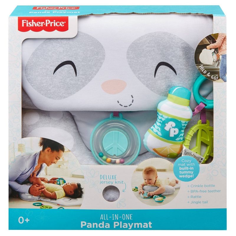 The Fisher-Price All-in-One Panda Playmat provides your baby an engaging spot for comfortable tummy-time play, at home or while traveling. The plush, contoured mat has a built-in wedge to help support your little bear as they play during tummy time. There are four exciting activities for your baby to explore, including a peace sign baby rattle, leaf-shaped teething toy, crinkly "water bottle" toy, and a fun jingle sound in the panda's tail. When you're headed out, the playmat folds up with a convenient handle for take-along.