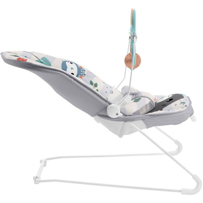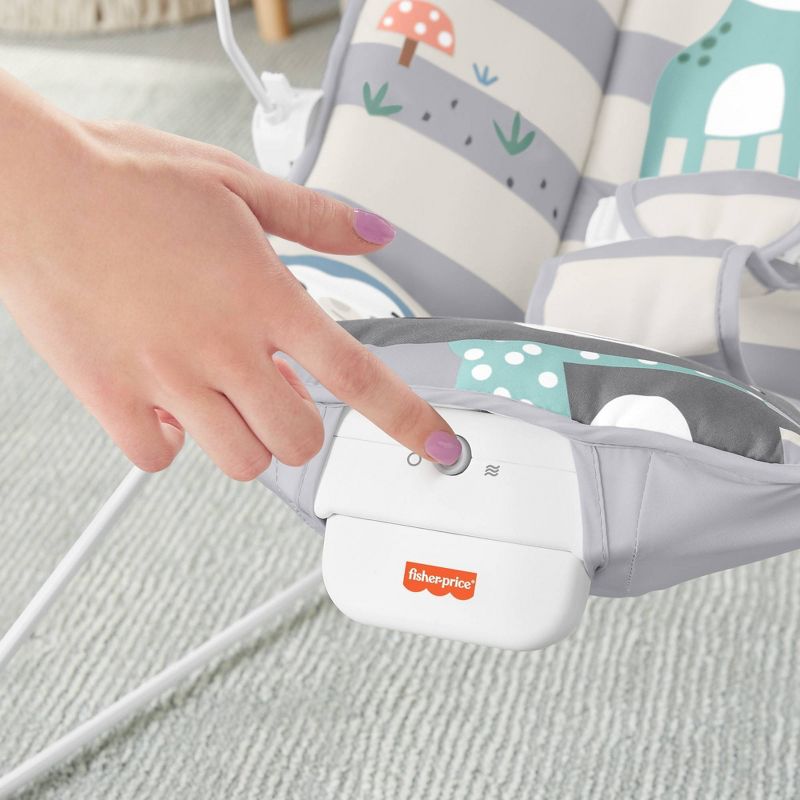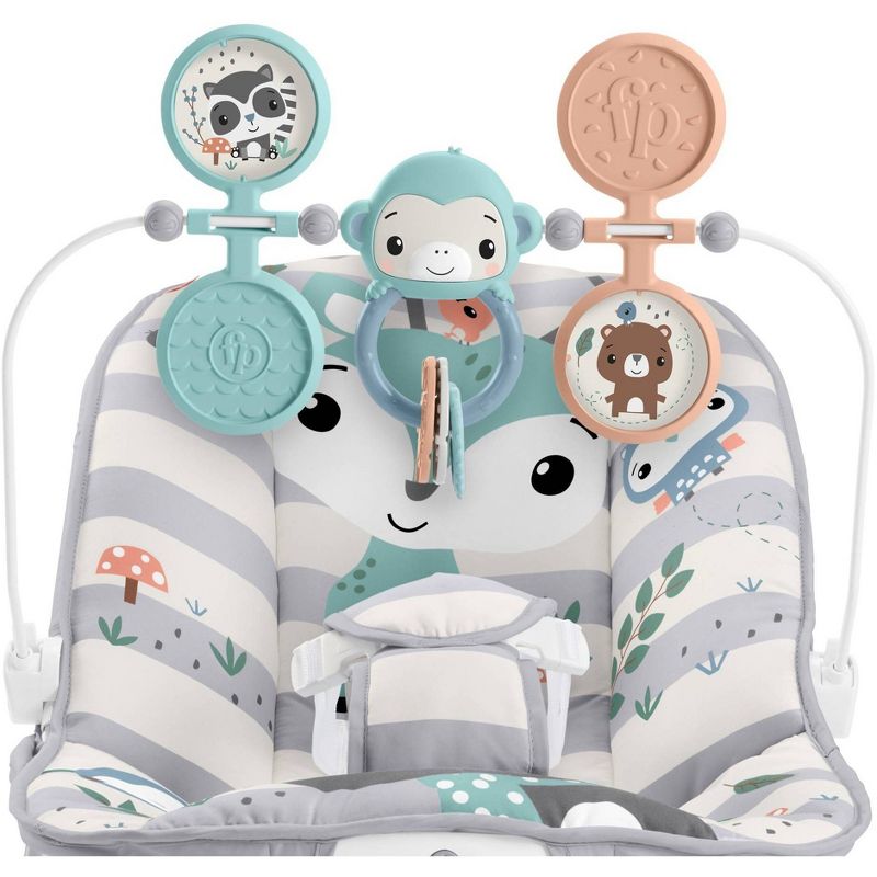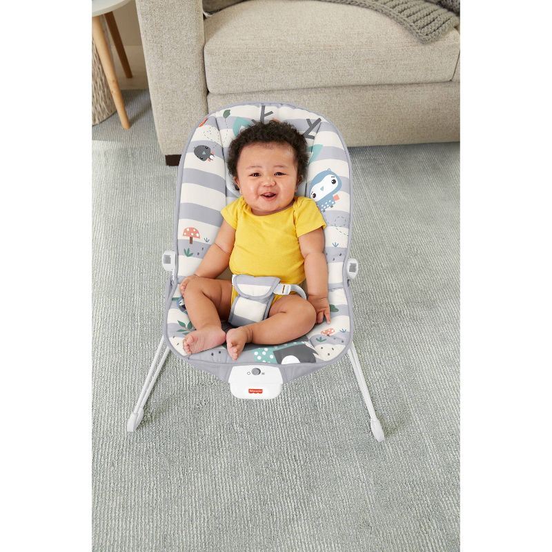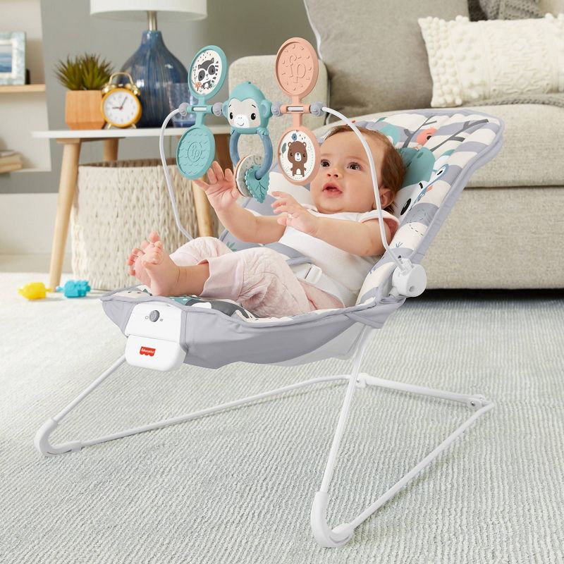 Help your baby get their bounce on with the Fisher-Price® Baby's Bouncer. This baby seat gently bounces along to your little one's natural movements and features calming vibrations at the touch of a button. The overhead toy bar is perfect for playtime, with three fun animal toys that clack and spin for plenty of bat-at fun! Max. weight 20 lb/9 kg Use from birth until child is able to sit up unassisted