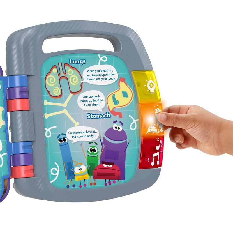 Travel through outer space with a T-rex and find out how many bones are in your body with Team 341B! The StoryBots Songbook musical toy from Fisher-Price gets kids rocking out to fun songs, sounds and fun facts as they 'read' along with their StoryBots friends. Each two-page spread introduces a different topic, including the planets of the solar system, dinosaurs, and the parts of the human body. Turn the book’s pages or press the light-up buttons to hear fun facts, sounds, and music.