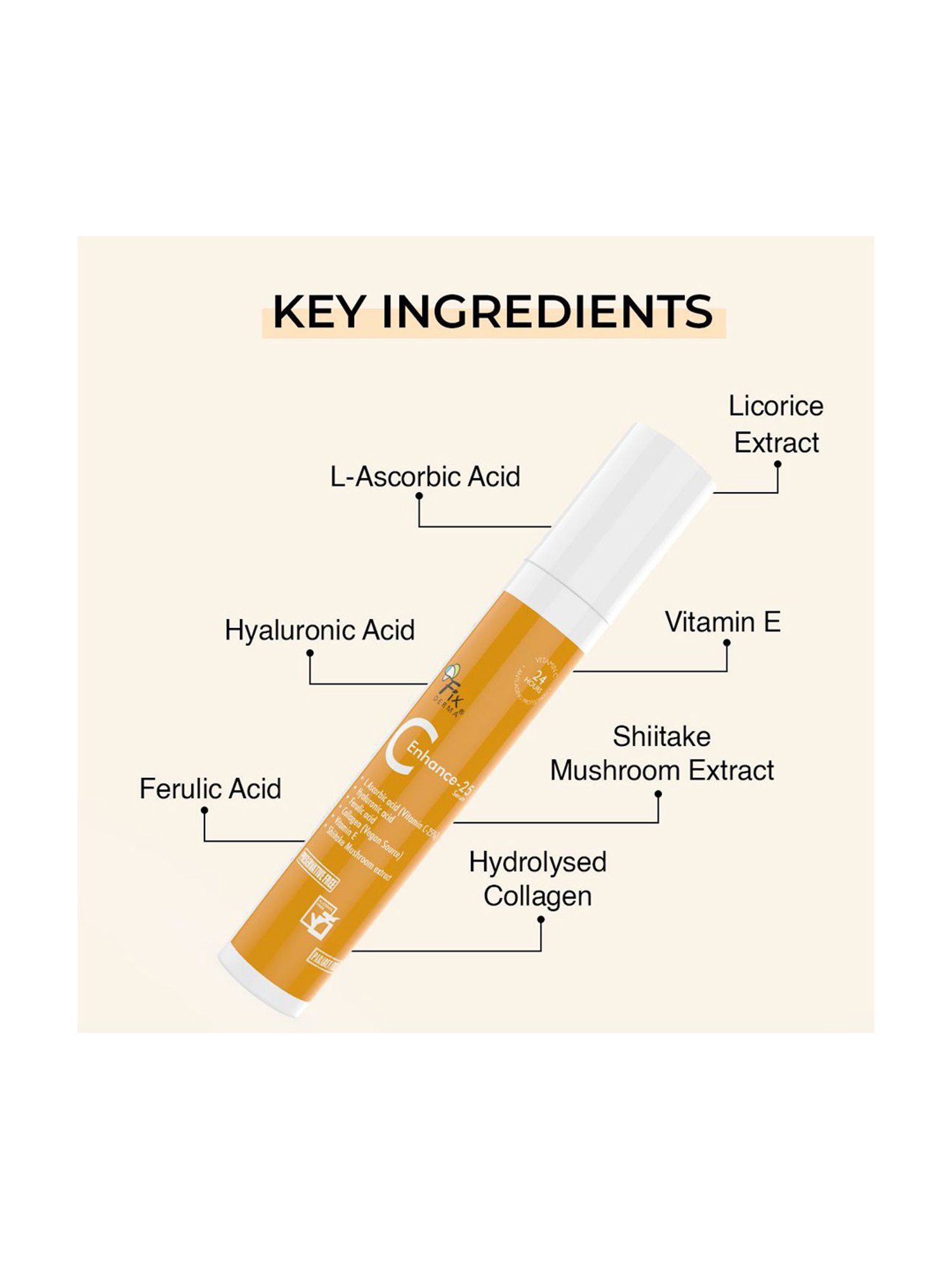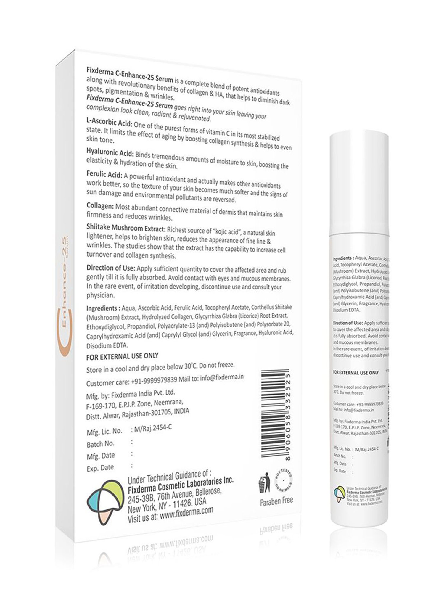Composition: Aqua, Ascorbic Acid, Ferulic Acid, Tocopheryl Acetate, Corthellus Shiitake (Mushroom) Extract, Hydrolysed Collagen, Glycyrrhiza Glabra (Licorice) Root Extract, Ethoxydiglycol, Propandiol, Polyacrylate-13 (and) Polyisobutene (and) Polysorbate 20, Caprylhydroxamic Acid (and) Caprylyl Glycol (and) Glycerine, Fragrance, Hyaluronic Acid, Disodium EDTA.
