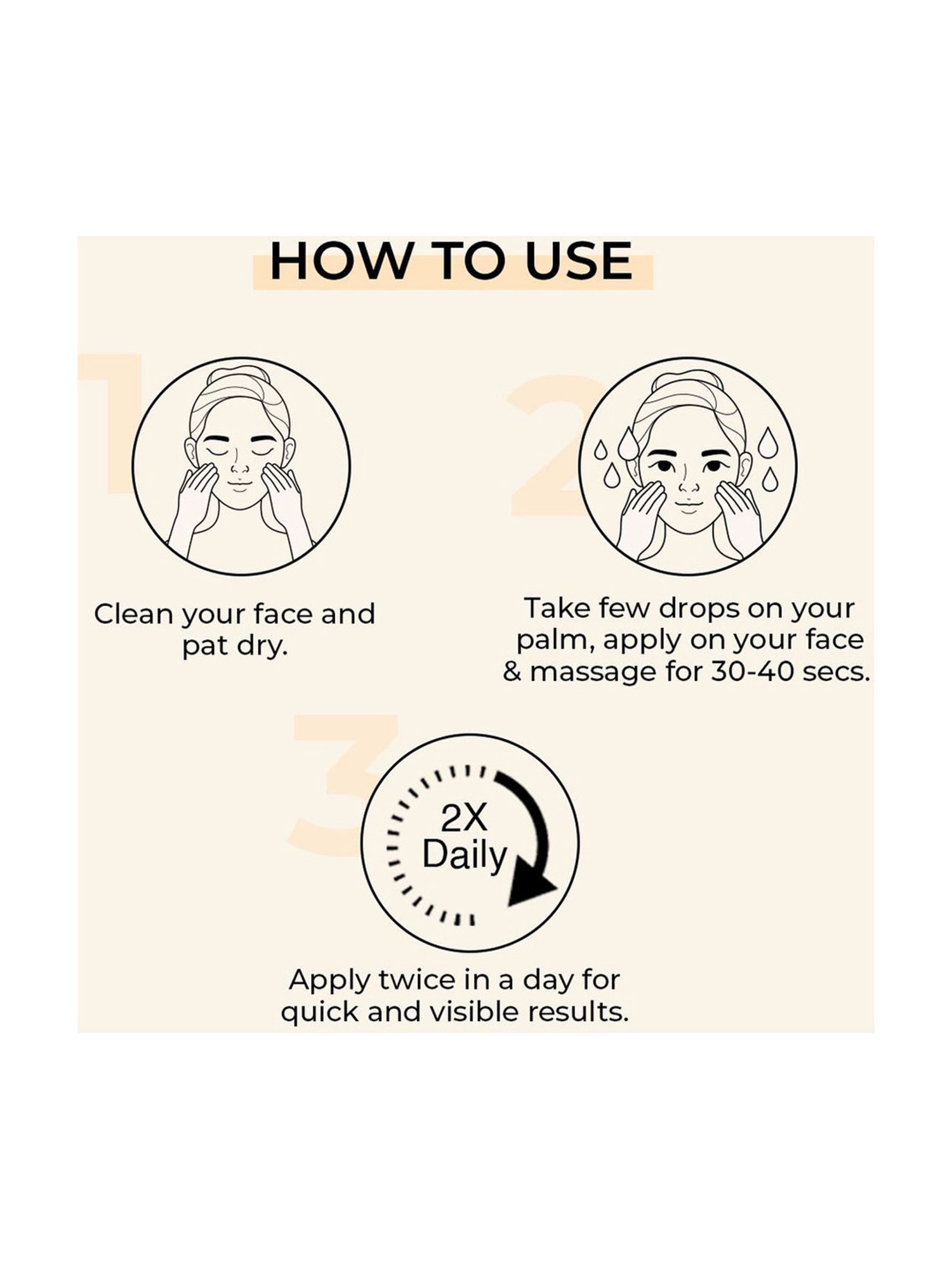 Clean your face and pat dry. Take 5 to 6 drops (approx. 1 ml) on your palm,apply on your face and massage for 30-40 secs. Its quickly absorbed into your skin. Apply morning and evening preferably for quick and visible results. |