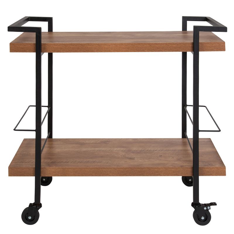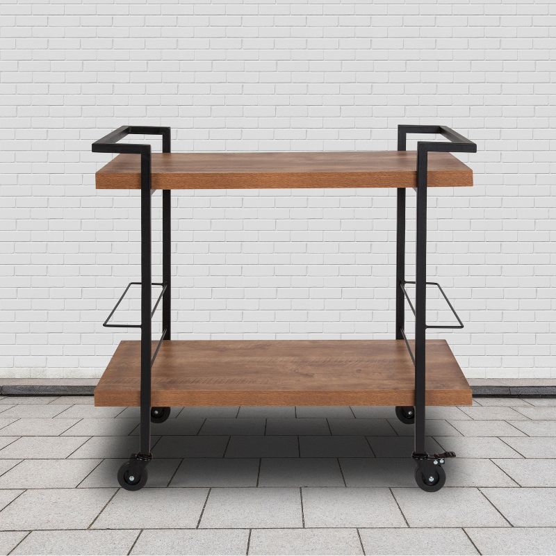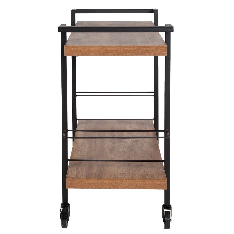 Mix up your decor while you mix drinks on this mobile utility cart. Present your bar and kitchen items in a chic, stylish way or use this versatile piece in other parts of the home as a display area for photos and decor or for holding bath towels and pretty decorative soaps and lotions. This mobile cart has enough character to fit in a contemporary or industrial style home. Open shelving allows you to easily retrieve your items while the two wire compartments on either side of the cart provide for bottle storage. Keep this piece looking great with a water-based cleaner. Additional Features: Wine Bottle Compartments Hold Up to 6 Bottles, Compartment Size: 3.75"W x 15.25"D x 6"H, Black Powder Coated Iron Frame, Four 3.5" Pac Swivel Casters